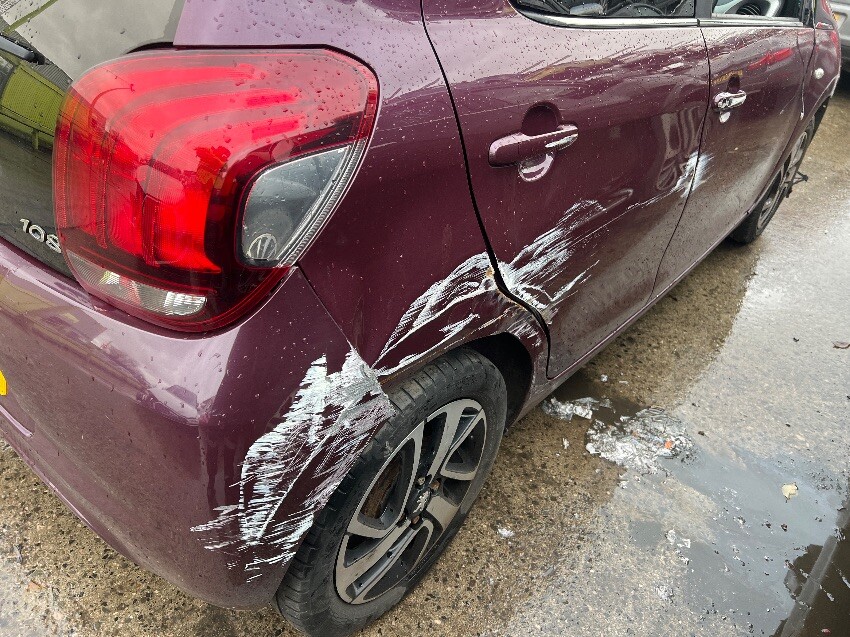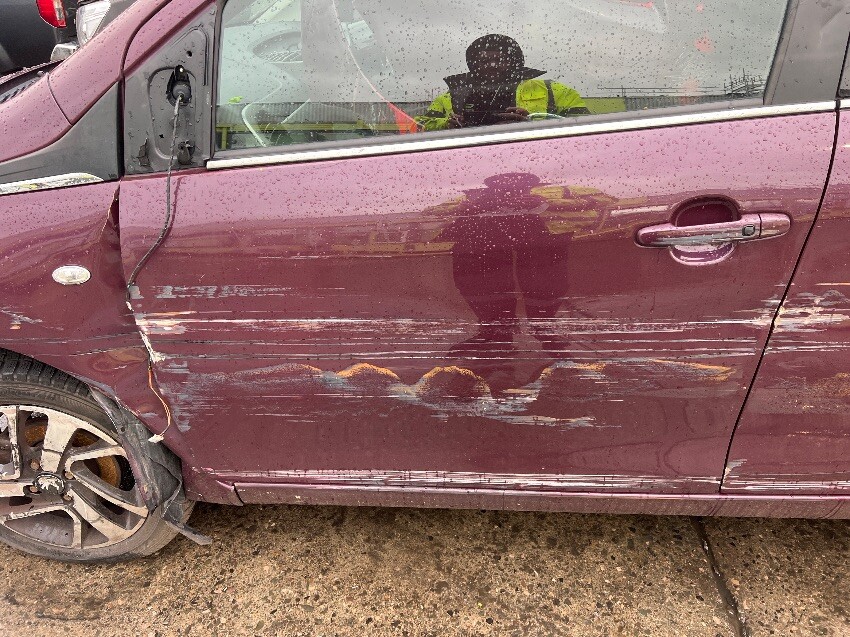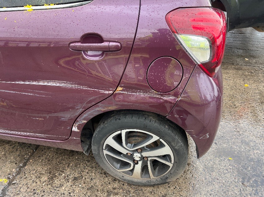 Rear bumper, nearside rear wheel arch, nearside passenger doors, nearside wing mirror, nearside front wheel, front bumper, bonnet, offside front wing, offside passenger doors, offside front passenger door window, offside wing mirror, bonnet doesn’t open, general wear and tear.