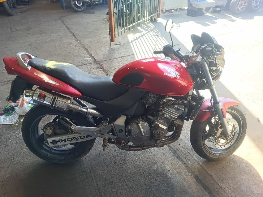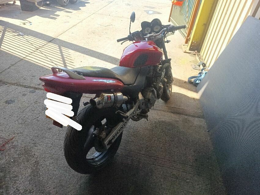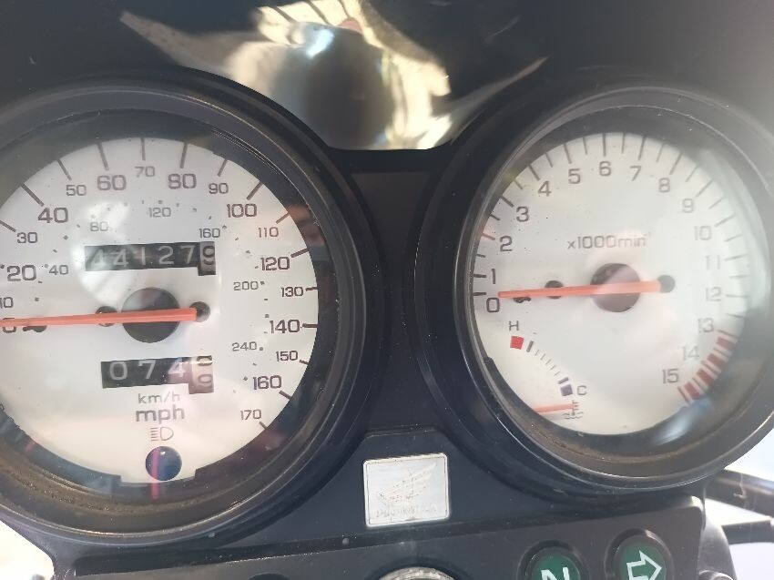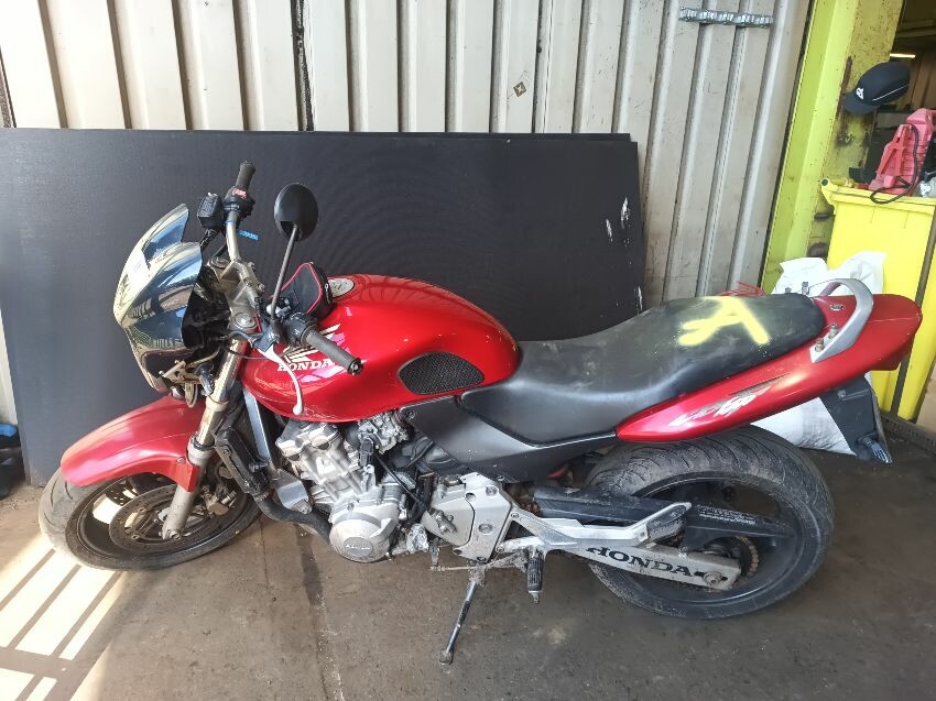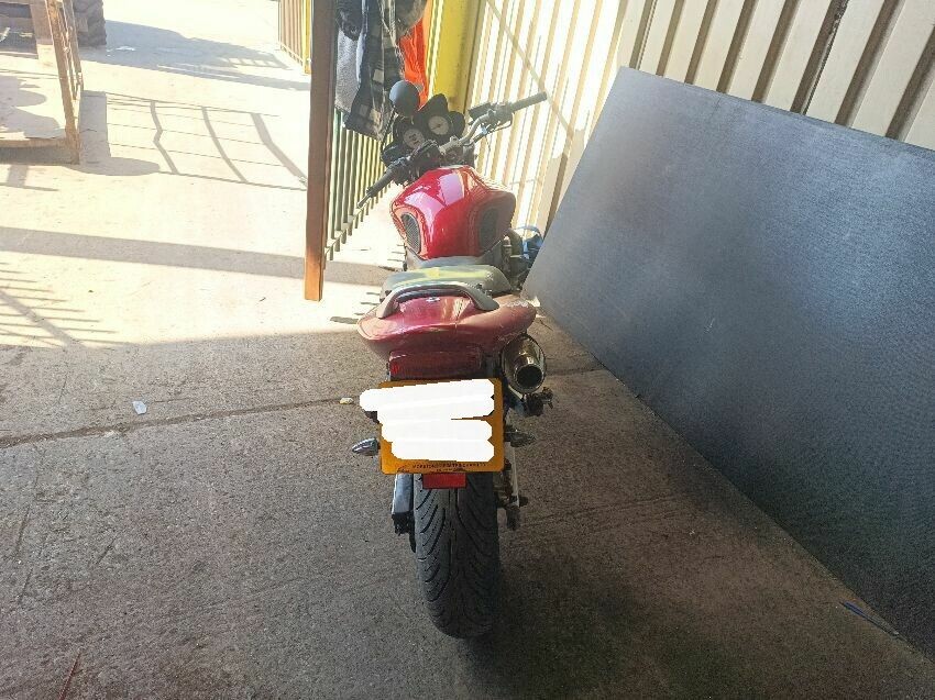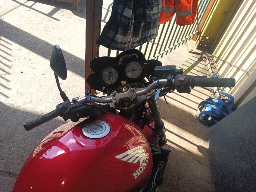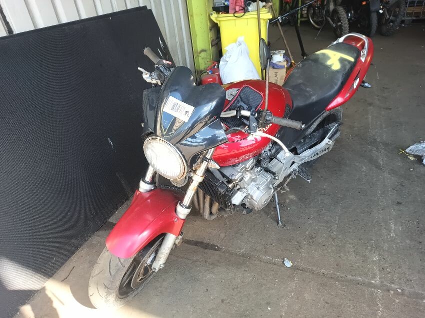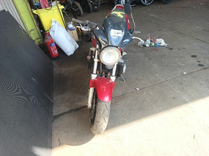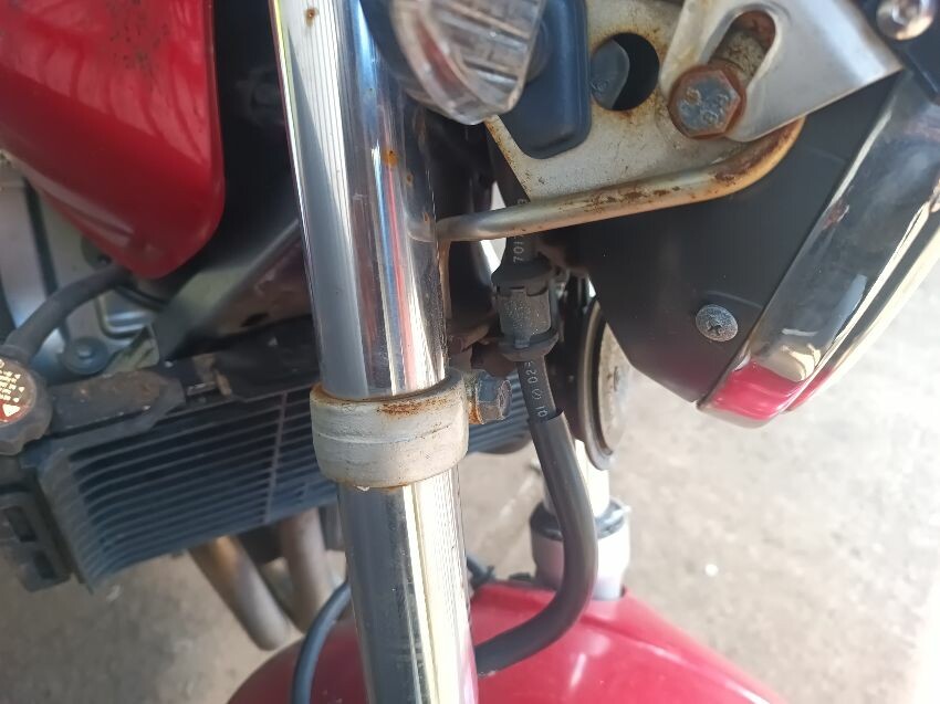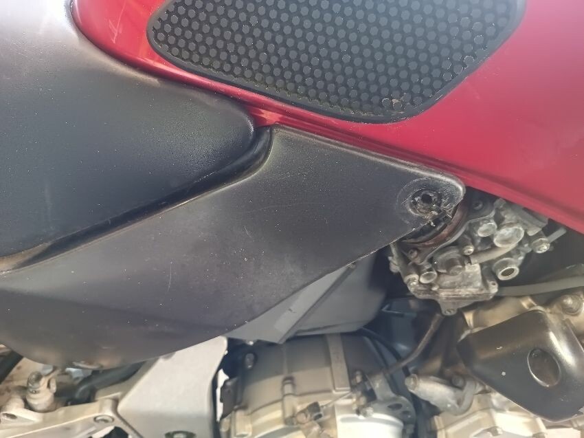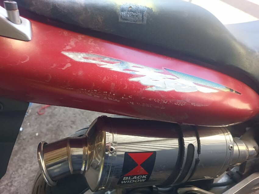 Torn seat, scuffed seat plastics, scuffed radiator, bar ends scuffed, right mirror missing, left mirror loose, front forks rusty, general wear and tear.