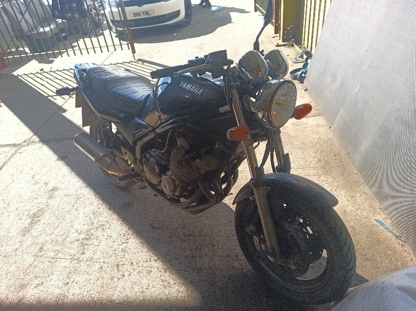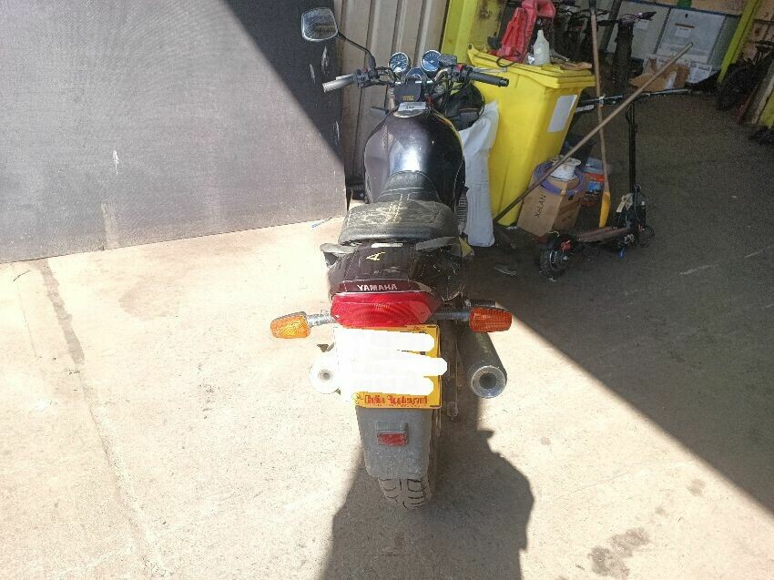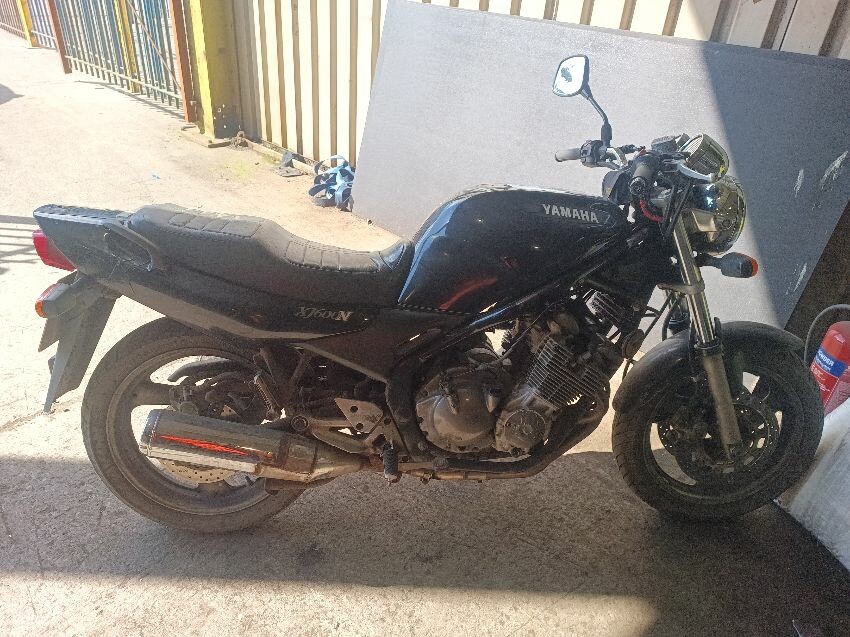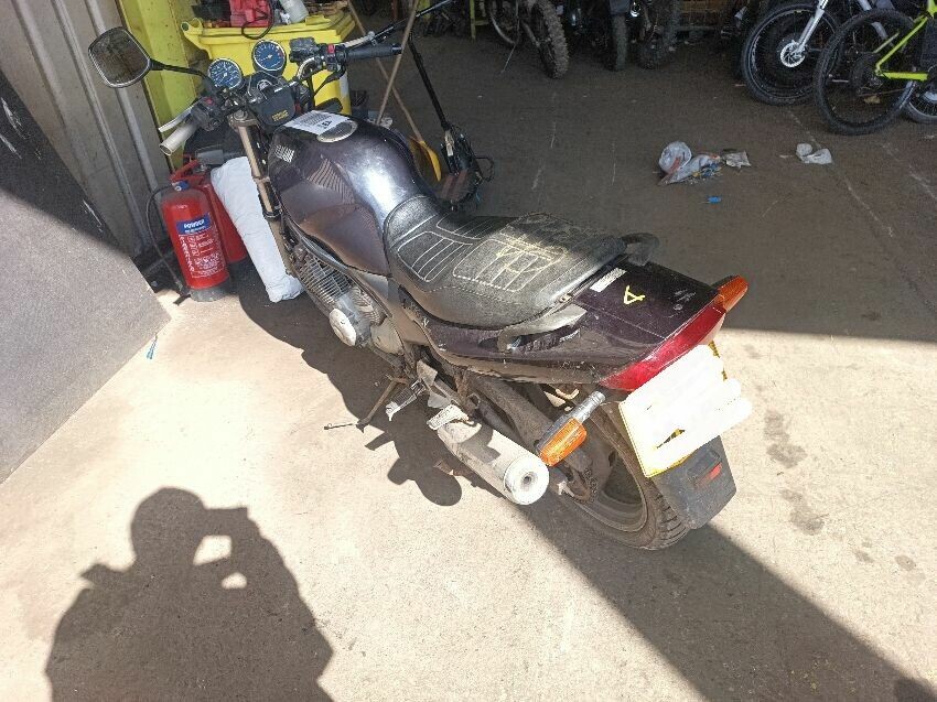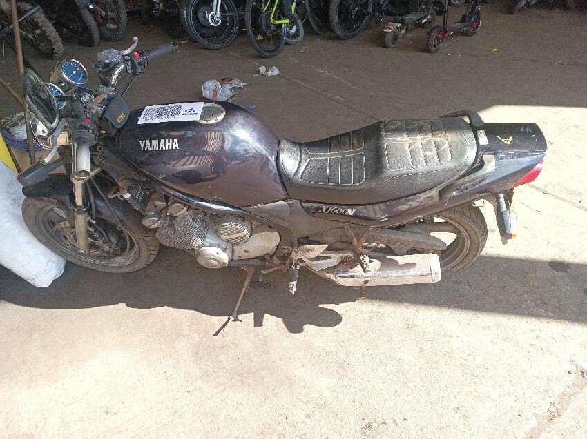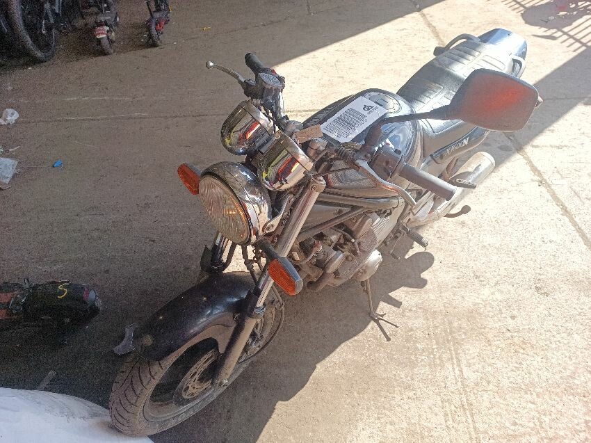 Clutch cable is stretched, brake reservoir is corroded, oil cooler fins damaged, instrument light cluster damaged, carb idle needs adjustment, bulbs dim, right exhaust muffler is scuffed, clutch lever is broken, right mirror missing, general wear and tear.