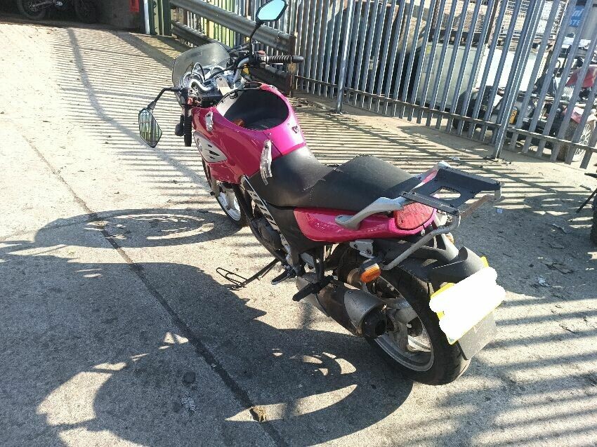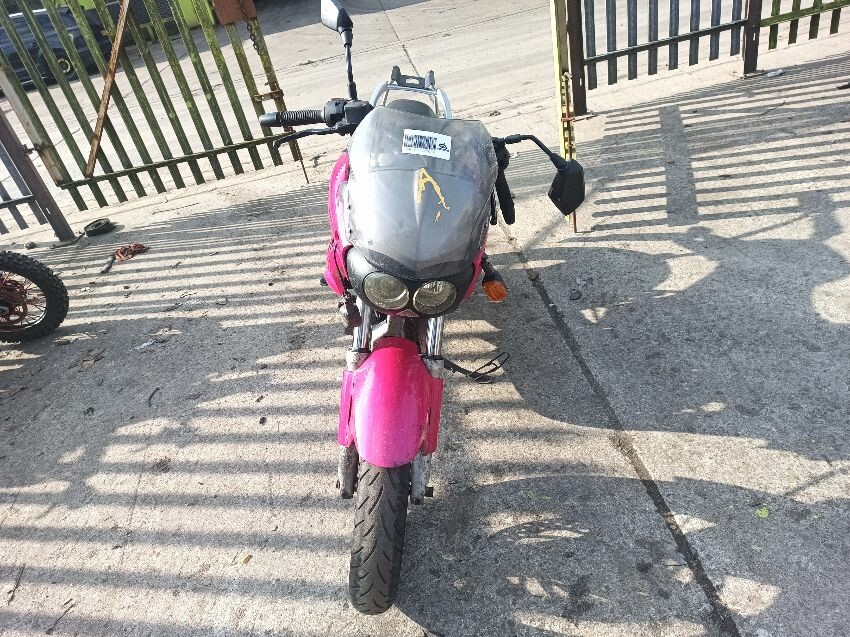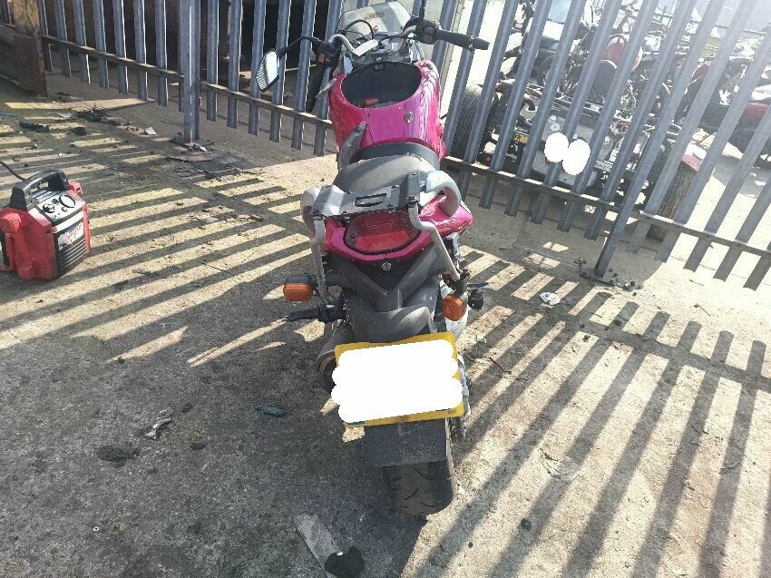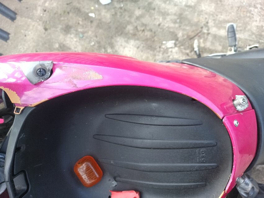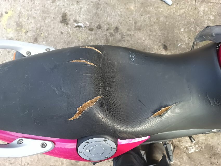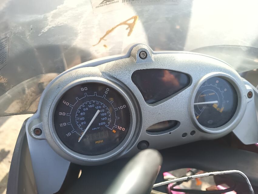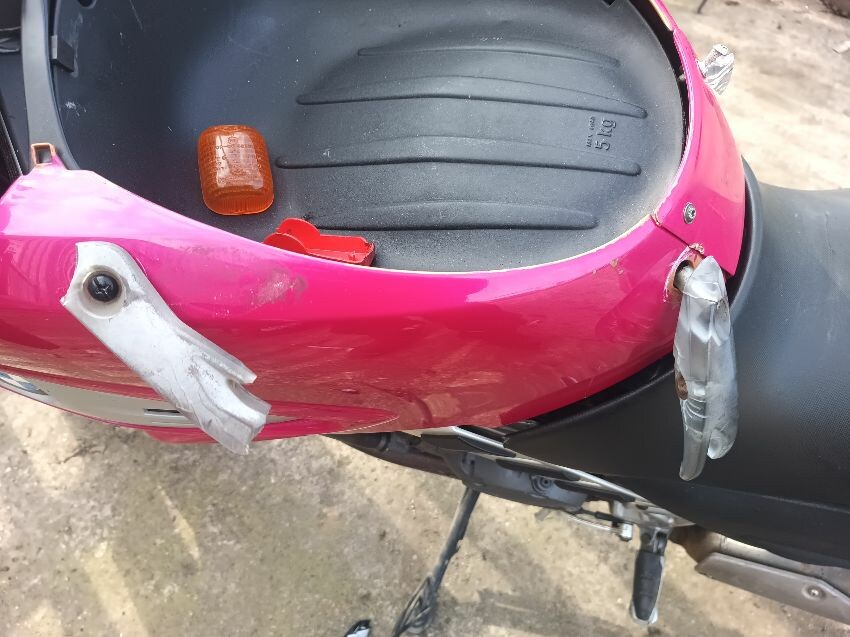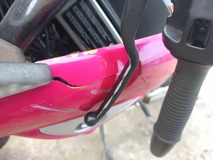 Seat torn in multiple places, right indicator has broken off, both front indicators are damaged, front cowling is cracked& damage, foot brake arm is bent, handlebars bent & off center, fake tank lid is missing, left pillion foot peg is missing it's spring, front handles broken, left mirror is damaged & loose, general wear and tear, paint fading.