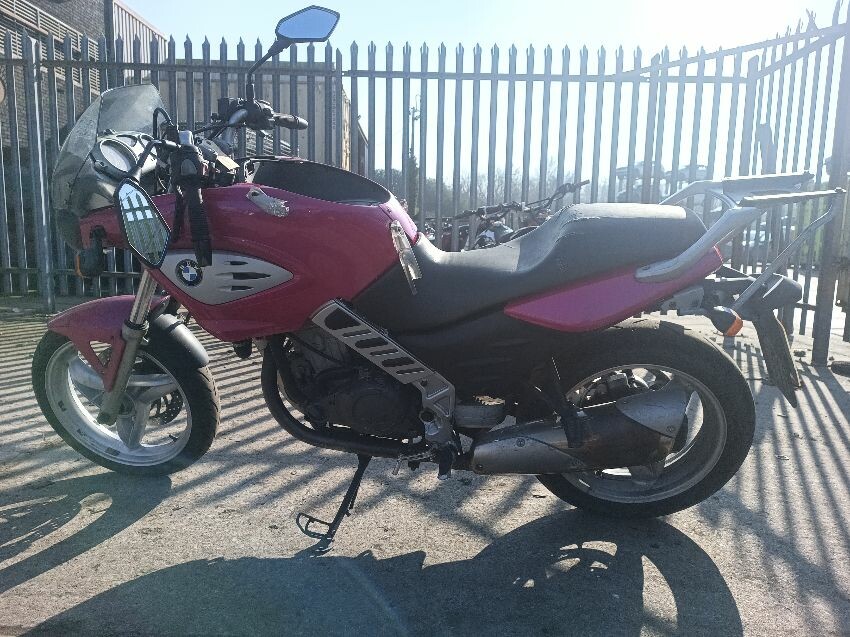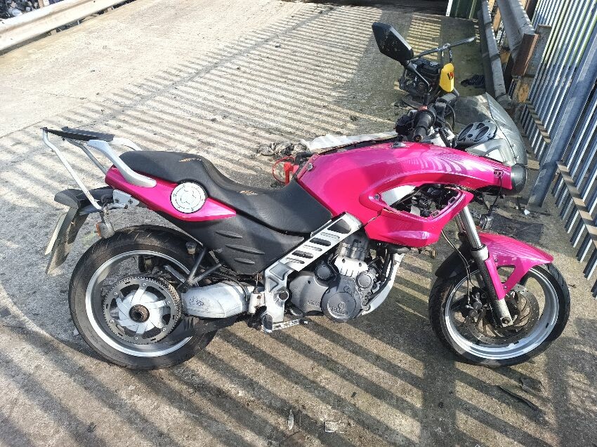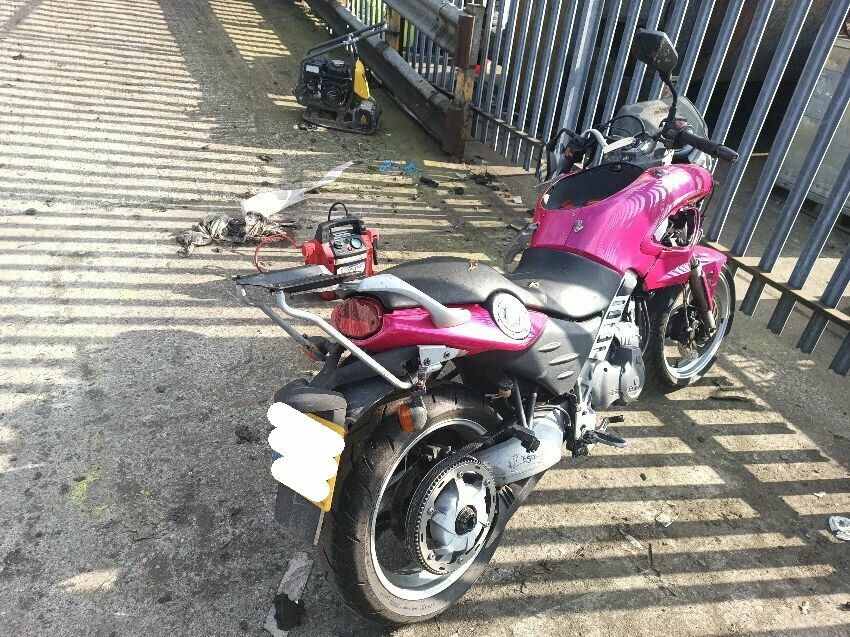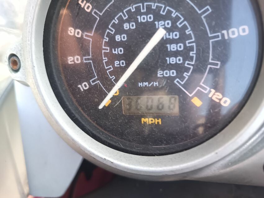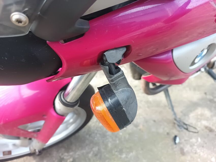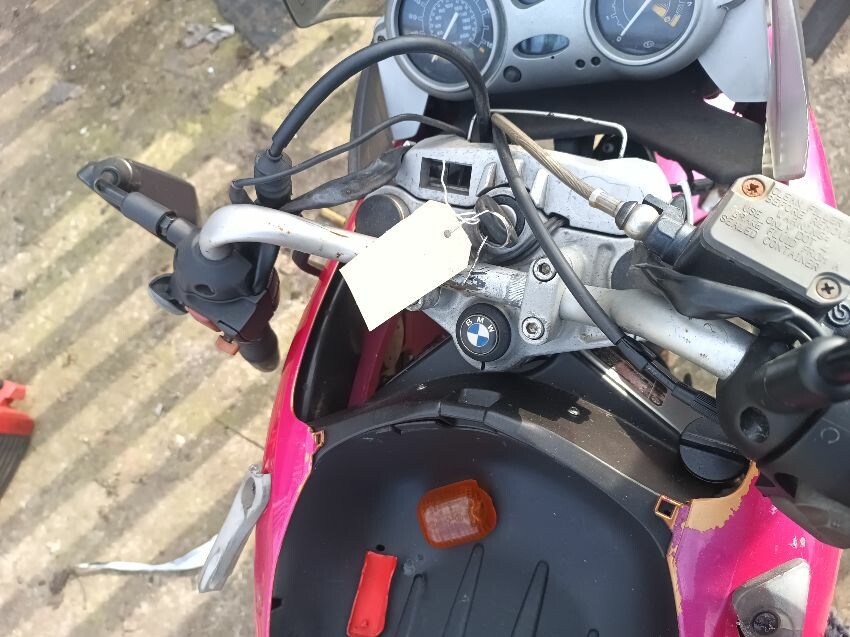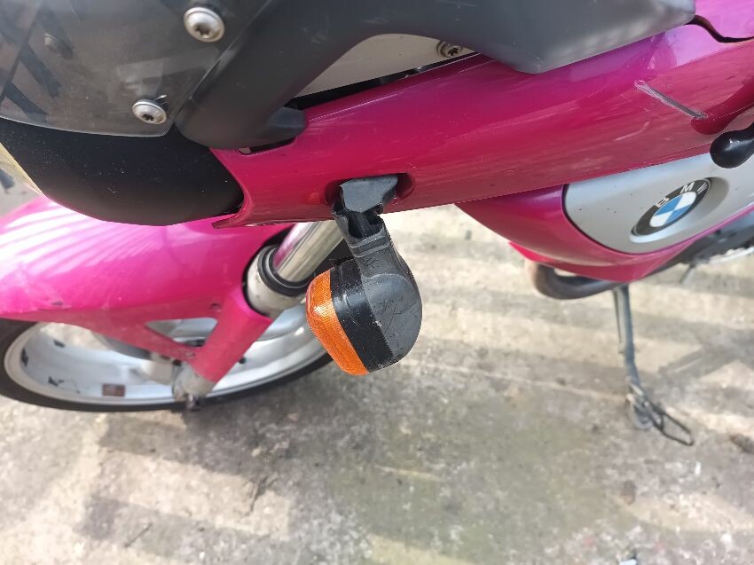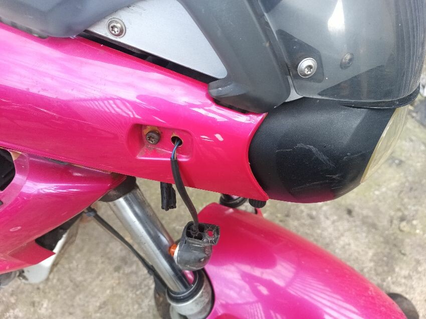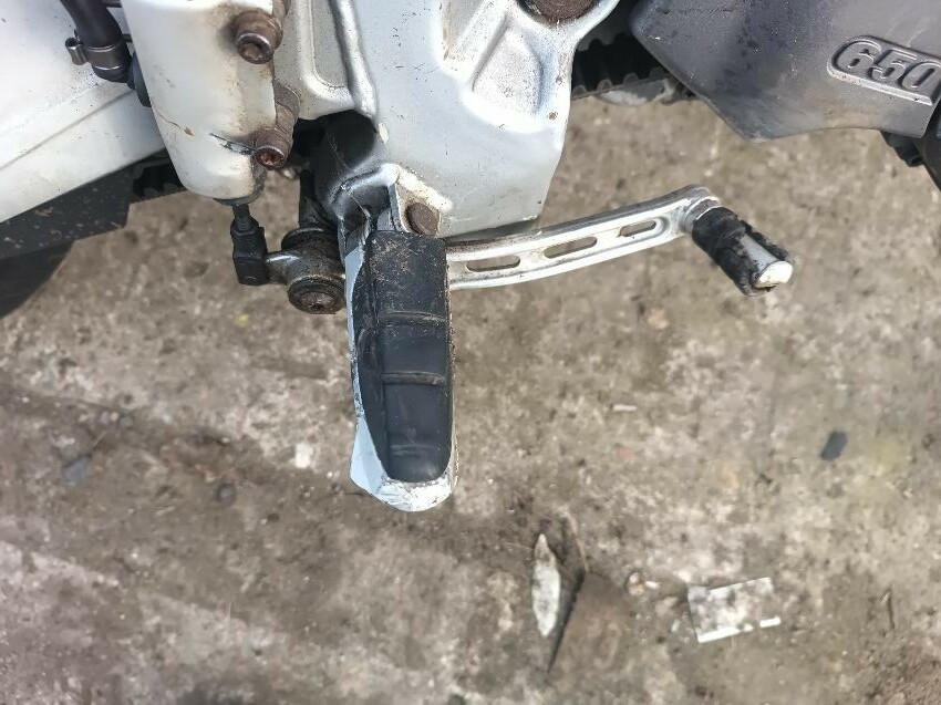 Seat torn in multiple places, right indicator has broken off, both front indicators are damaged, front cowling is cracked& damage, foot brake arm is bent, handlebars bent & off center, fake tank lid is missing, left pillion foot peg is missing it's spring, front handles broken, left mirror is damaged & loose, general wear and tear, paint fading.