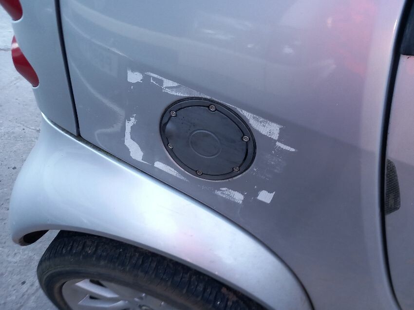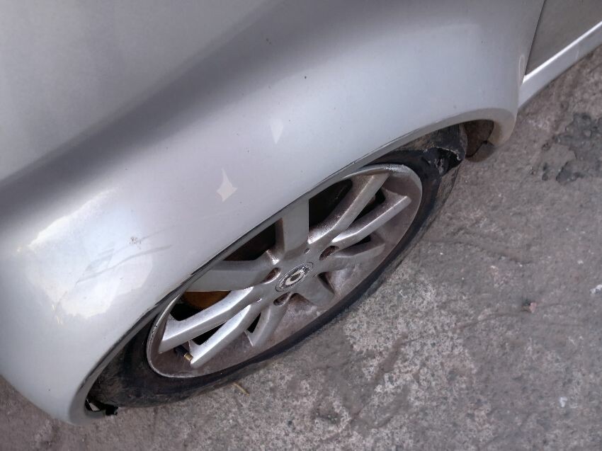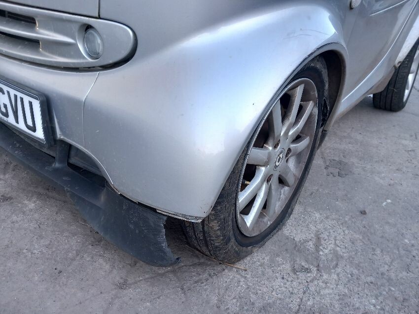 Scratches around vehicle, around fuel filler cap. wing mirrors. front bumper. front passenger side wheelarch and tyre with a tear in. rear reg plate missing. missing mirror glass passenger side mirror.