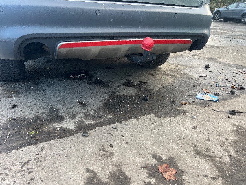 Nearside rear wheel arch, nearside front wing, front bumper, offside front wing, exhaust missing, general wear and tear.