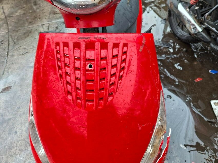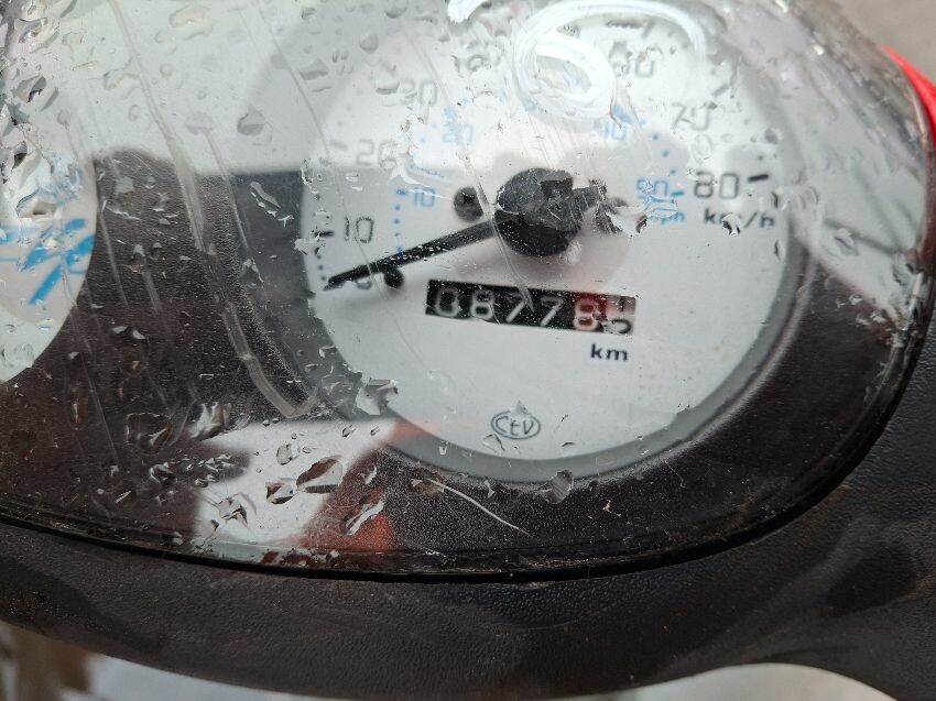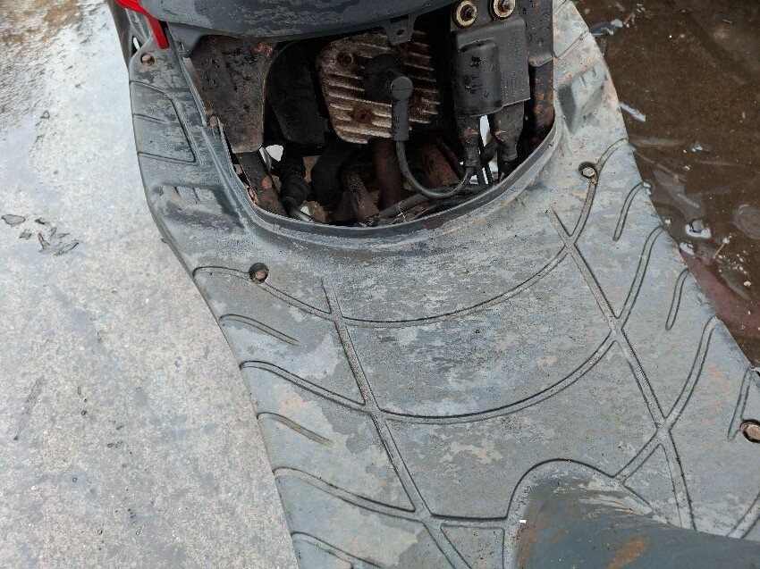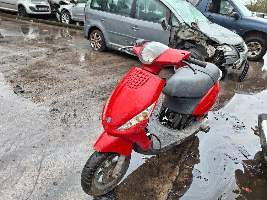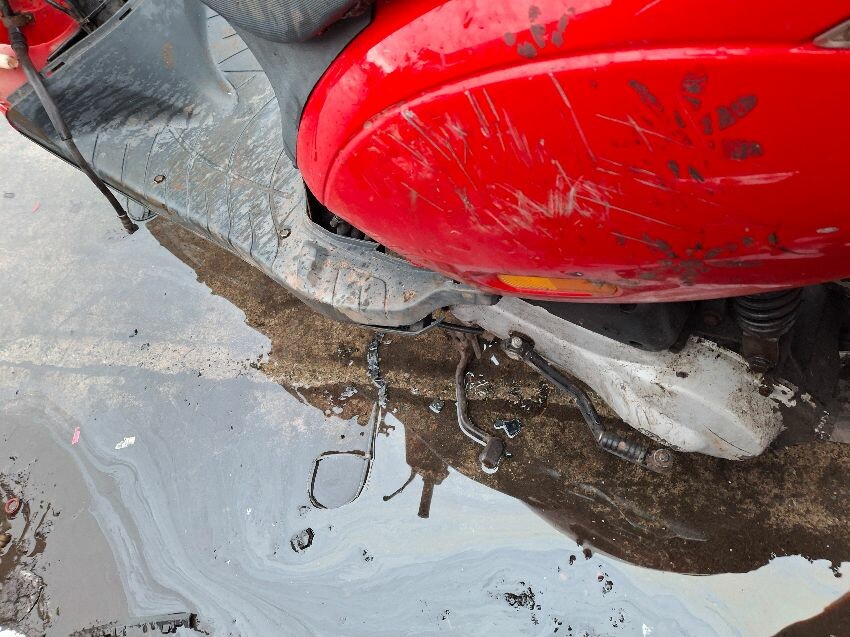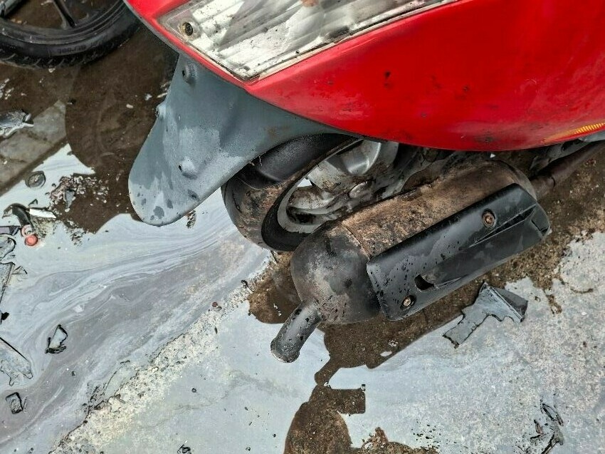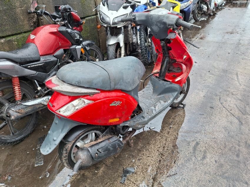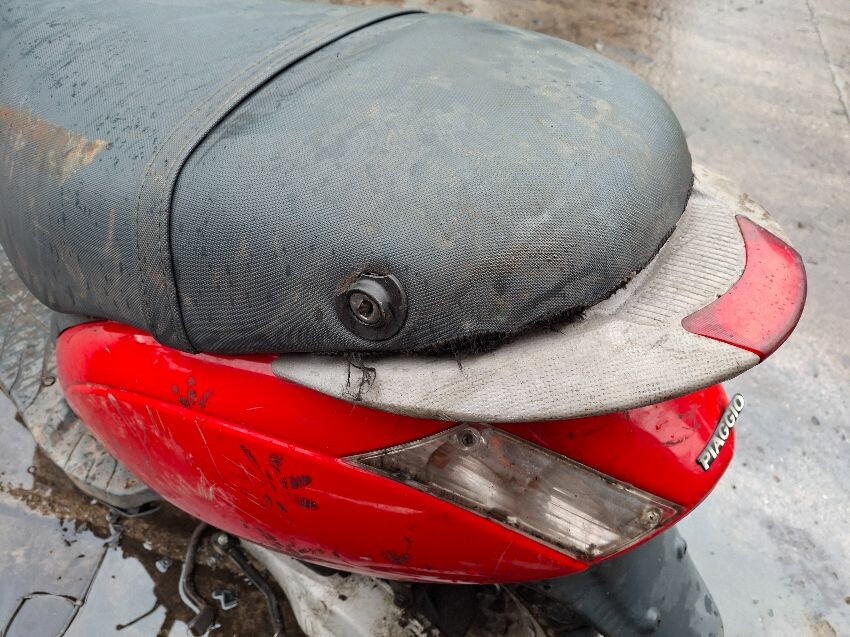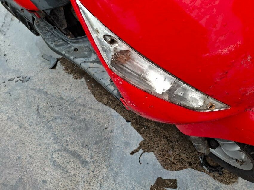 Wear and tear. mirrors and areas of trim missing. seat, handlebars and lights damaged. major and minor scratches, dents, cracks and paint damage to the vehicle. wires hanging.