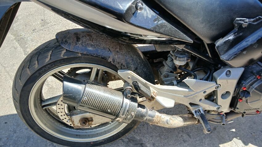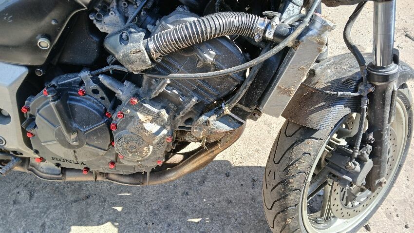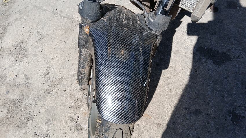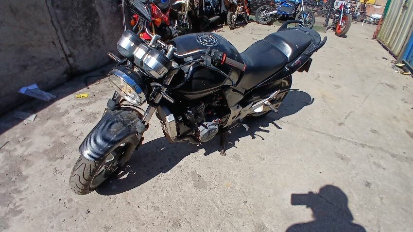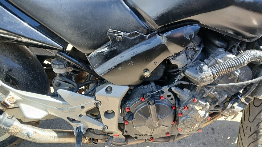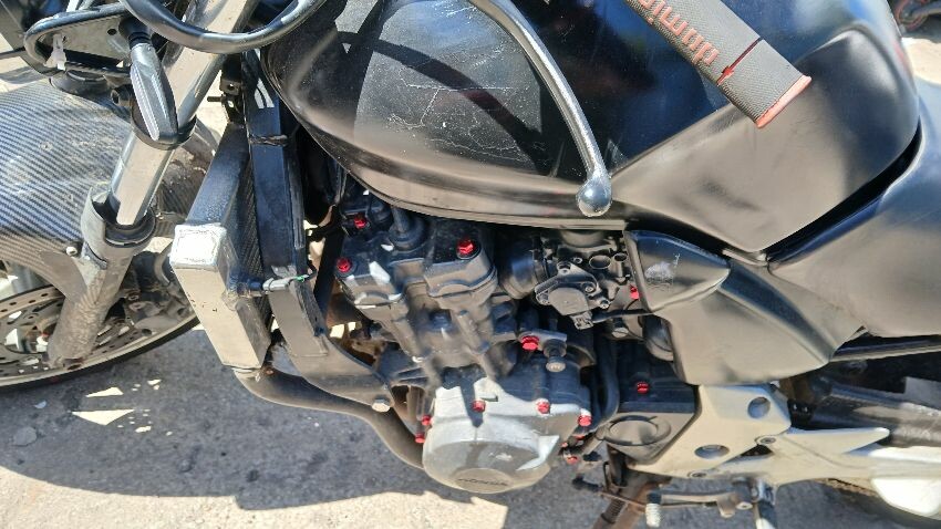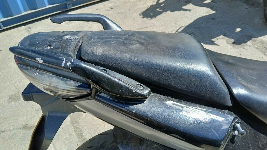 Front mudguard, front headlight unit, handlebars, clocks, n/s fairings, seat, o/s fairings, o/s engine casing, possible radiator leak, scuffs and scratches all over, general wear and tear for age and mileage, foot brake, poor respray