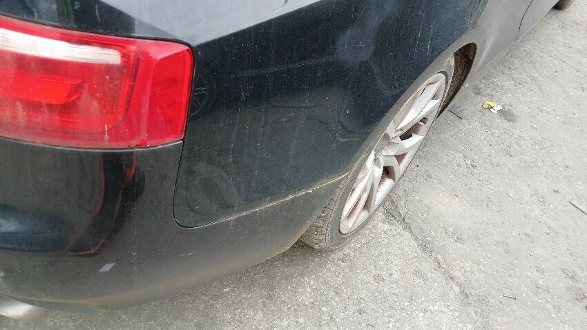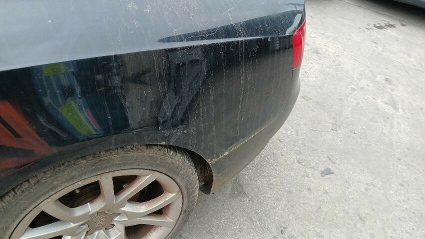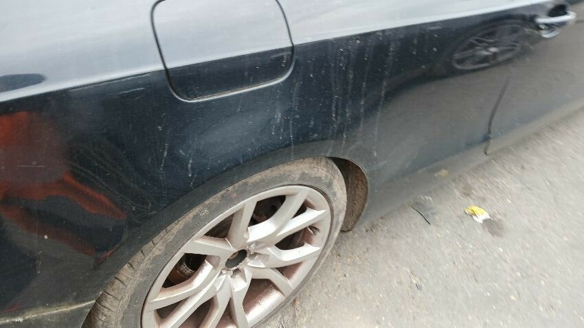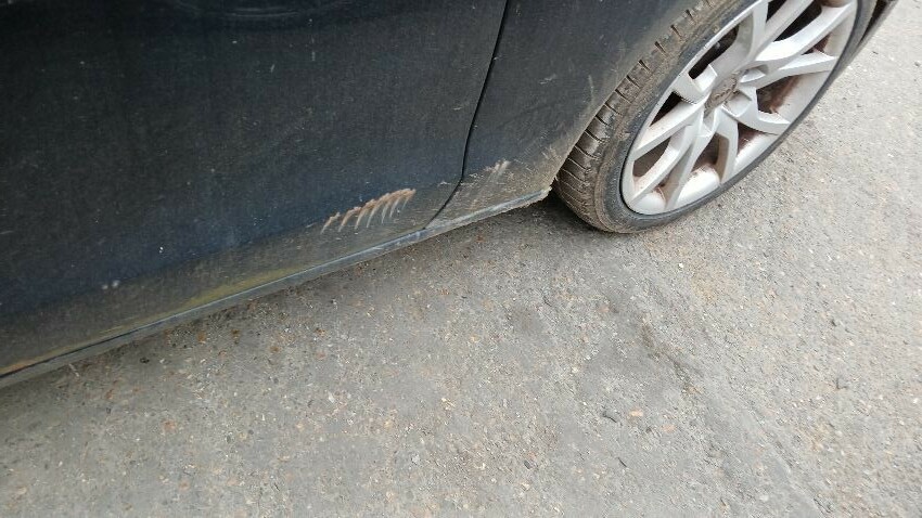 Front bumper, n/s front wing, n/s door, n/s rear quarter, rear bumper, o/s rear quarter, o/s door, o/s front wing, scuffs and scratches all over, general wear and tear for age and mileage, areas of rust throughout, engine management light on