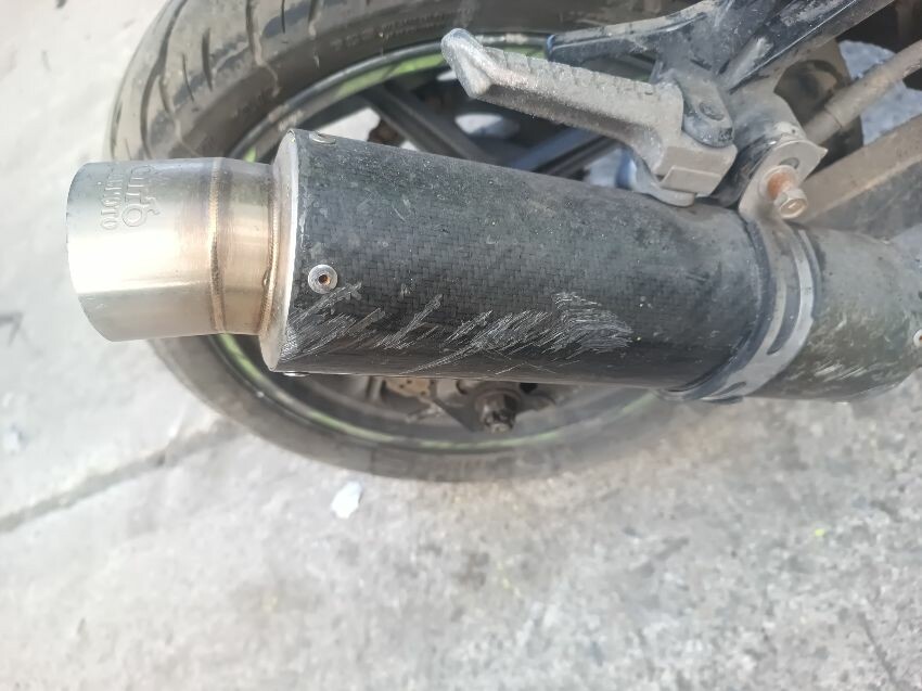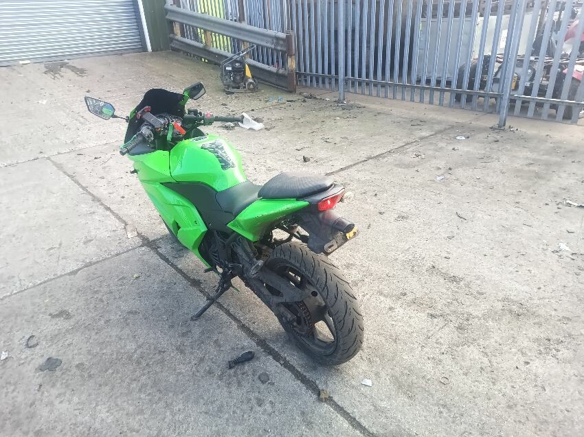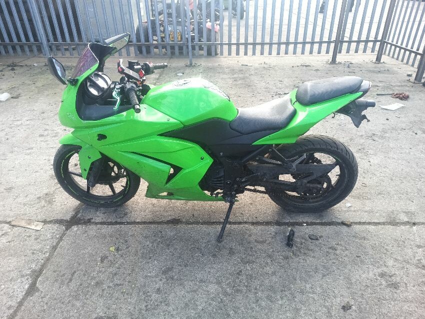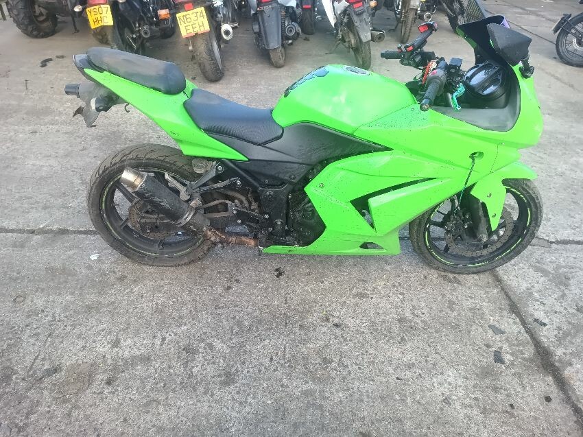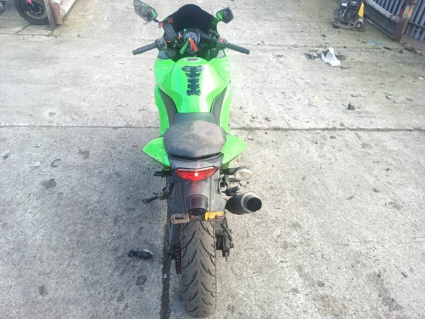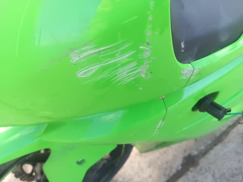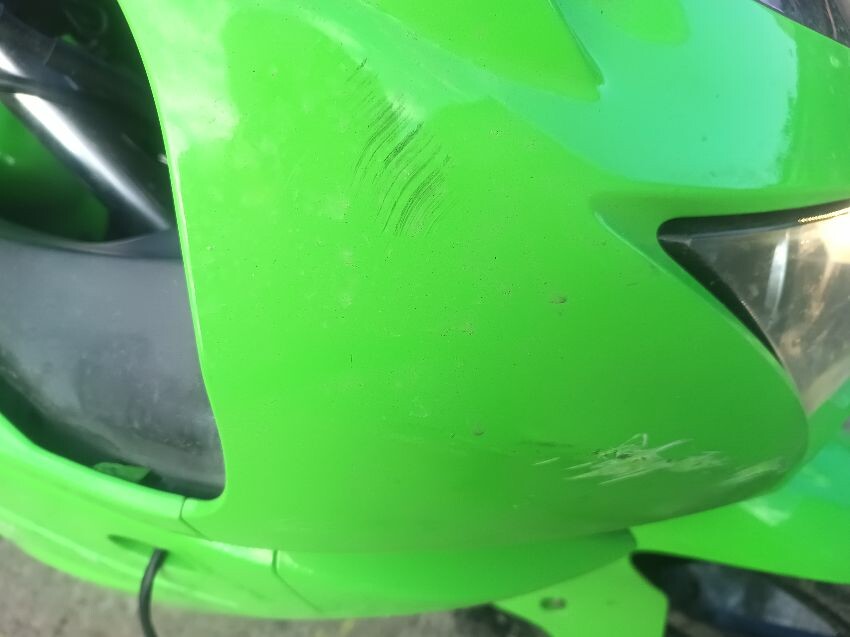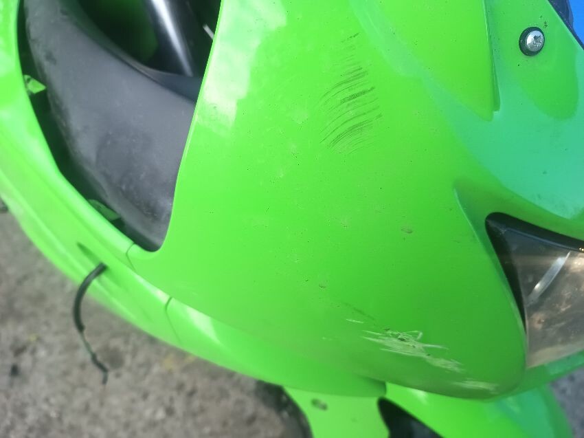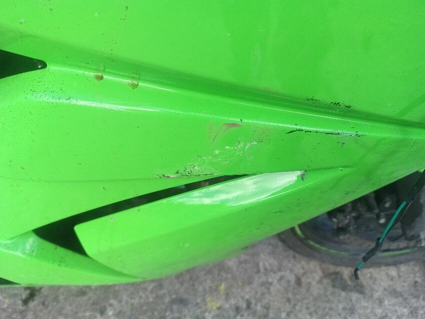 Rear left indicator has snapped off, left foot peg has snapped off, shifter bracket loose, front left indicator missing, front cowling is damaged, right mirror loose, right indicator missing, lower right cowling damaged, muffler damaged, rear tyre flat, general wear and tear