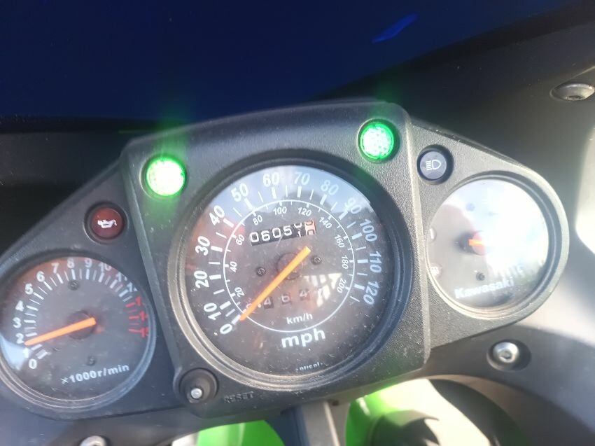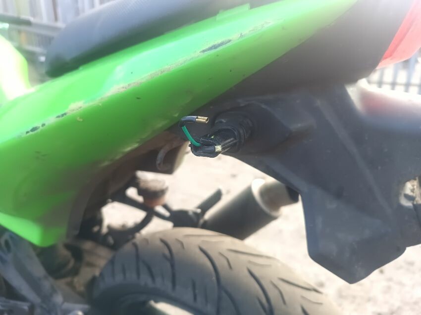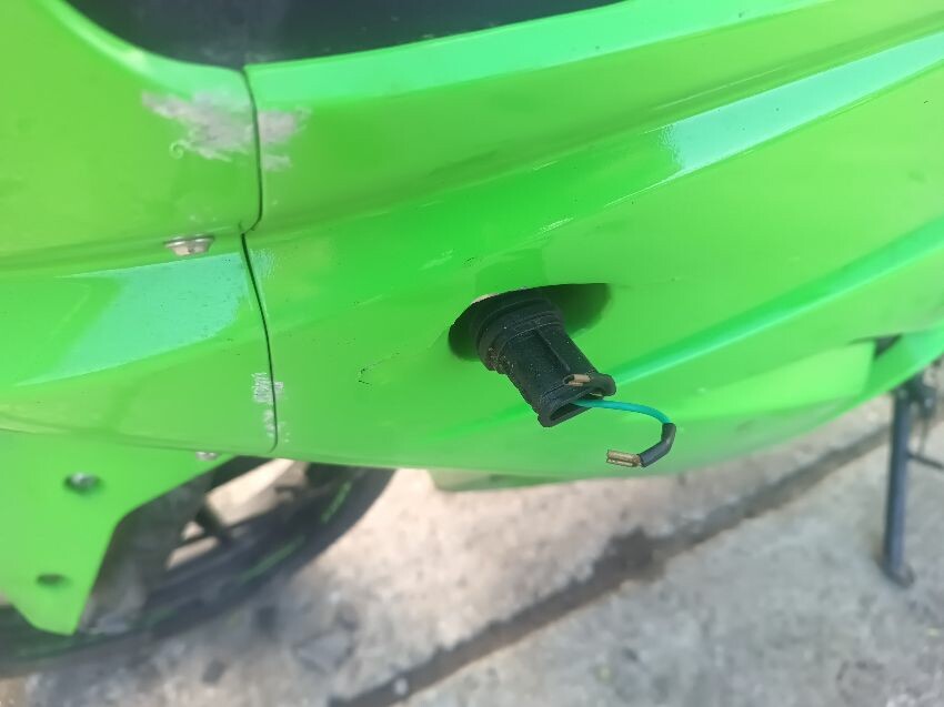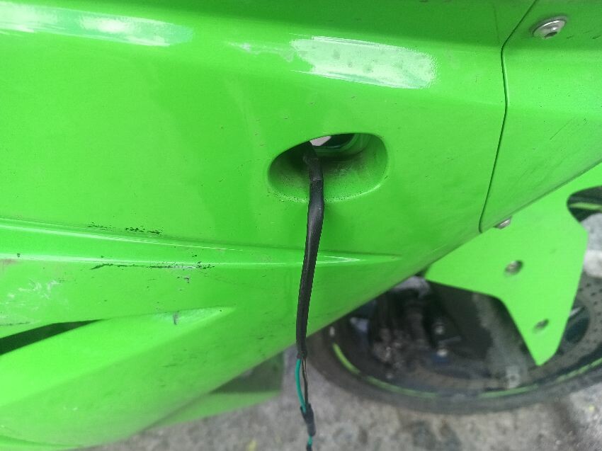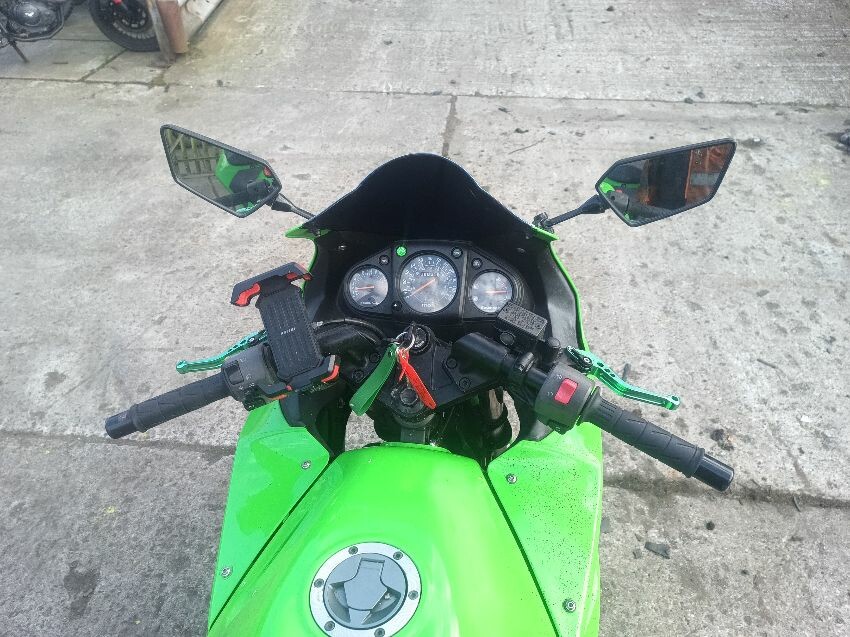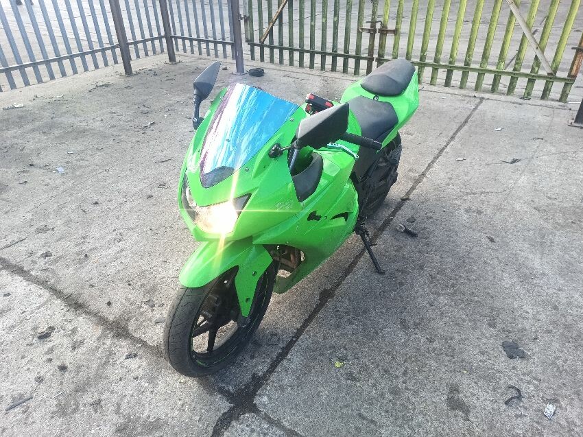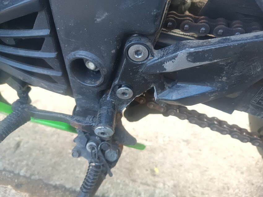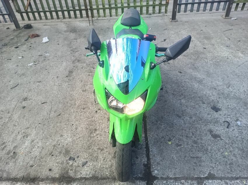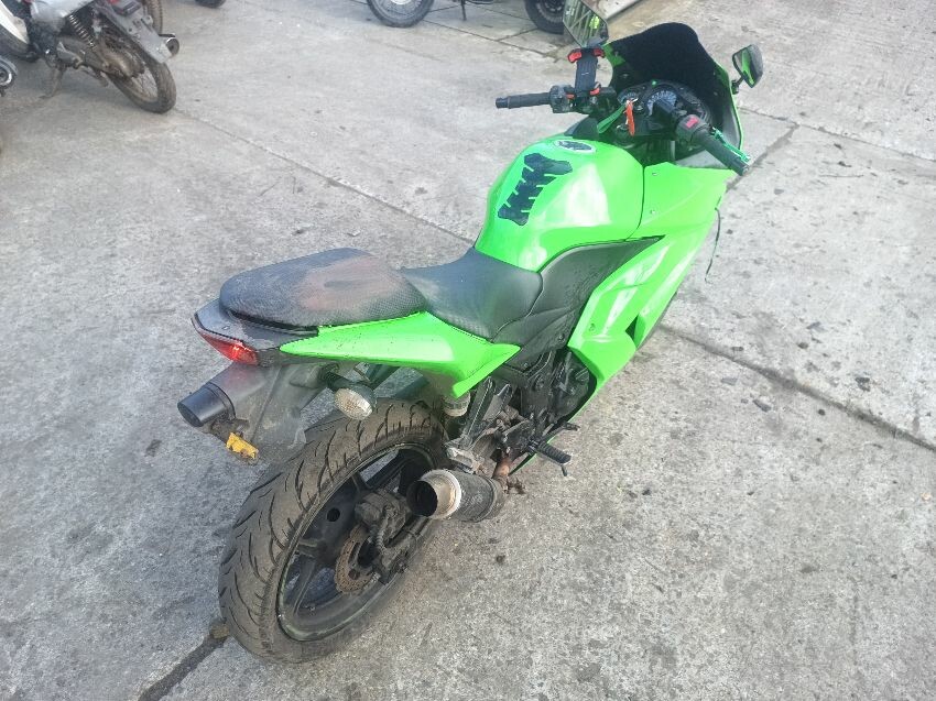 Rear left indicator has snapped off, left foot peg has snapped off, shifter bracket loose, front left indicator missing, front cowling is damaged, right mirror loose, right indicator missing, lower right cowling damaged, muffler damaged, rear tyre flat, general wear and tear