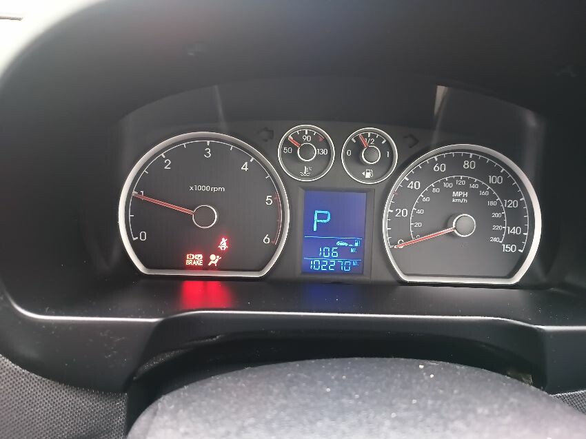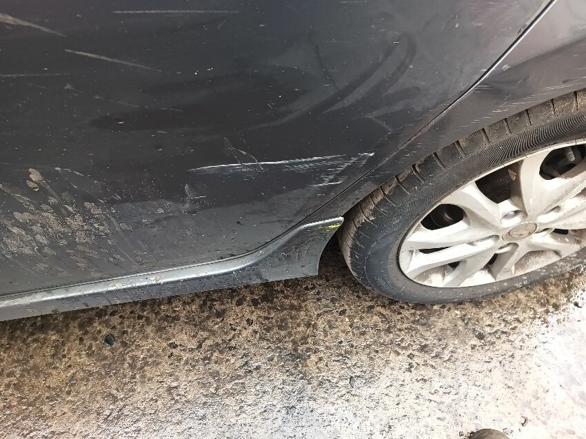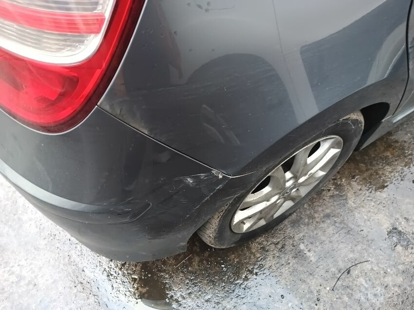Hand brake not locking on fully, broken/loose front bumper, dent in the passenger rear door, damaged rear bumper, general wear and tear