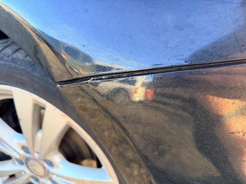 Small crack on bumper o/s corner above wheel. paint cracking o/s rear wheel arch. general wear and tear.