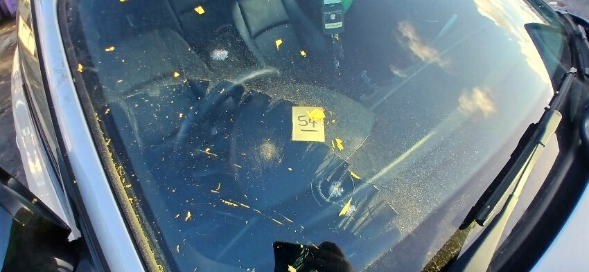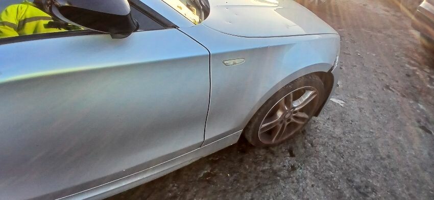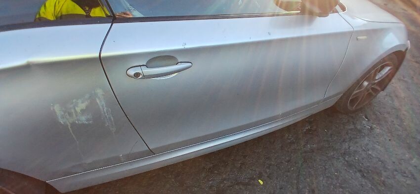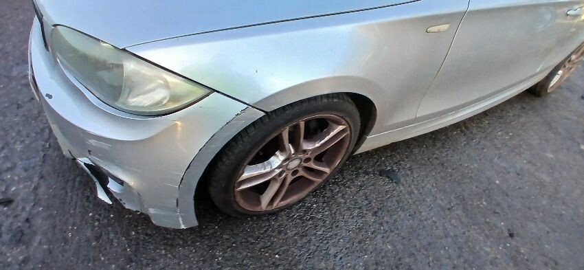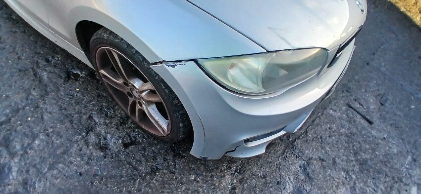 Front bumper, front windscreen cracked, n/s front wing, n/s wing mirror, n/s door, n/s rear quarter, rear bumper, boot lid, o/s rear quarter, o/s door, o/s front wing, scuffs and scratches all over, general wear and tear for age and mileage, engine knocking, exhaust blowing