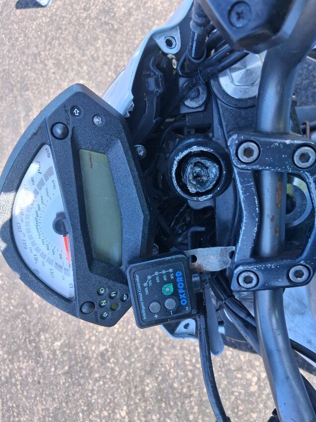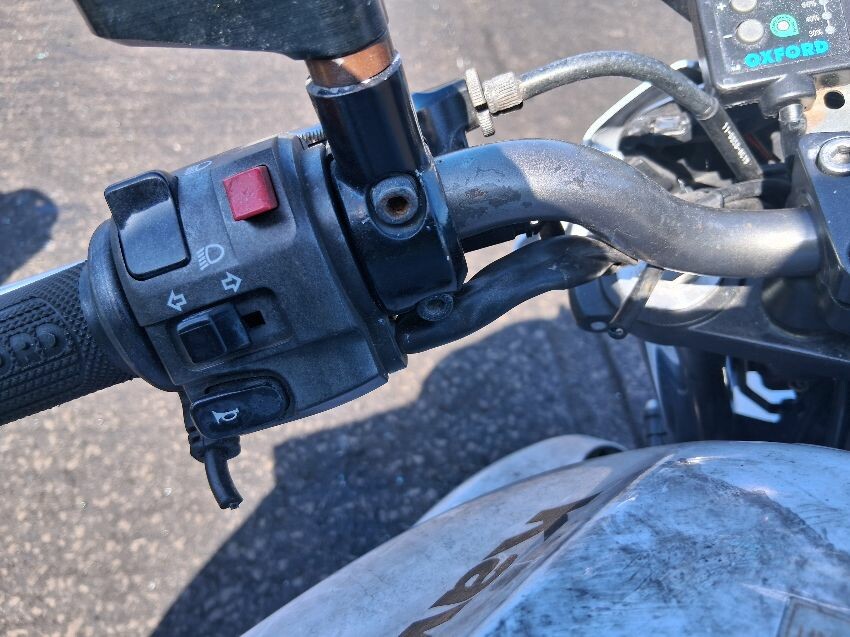 Clutch disengaged, ignition barrel tampered, both mirrors missing, general wear and tear and scratches.