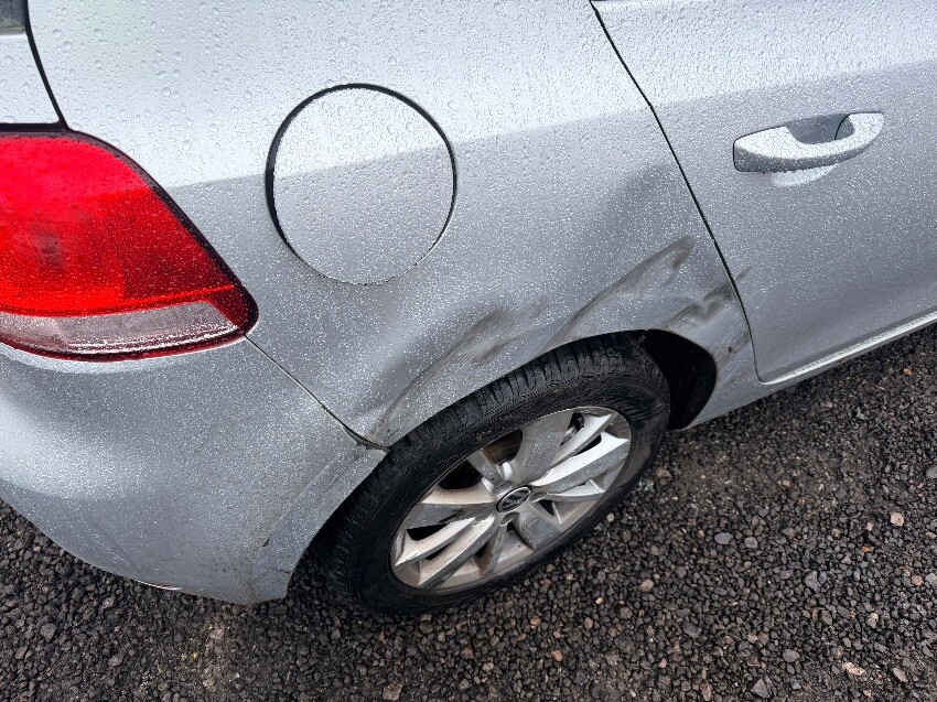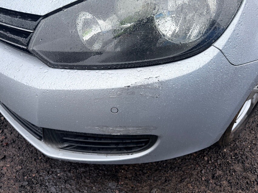 Damage to front bumper, o/s corner, scuffs on n/s corner. o/s rear wheel arch dented. general wear and tear.
