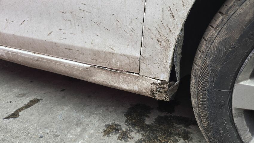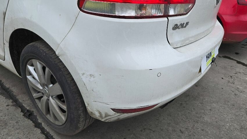 Front bumper damaged, o/s/f wing damaged, bonnet misaligned, o/s/f door and sill damaged, o/s/f wheel arch lining coming away, n/s/f wing scratched, n/s wing mirror damaged, n/s/f door has paint chips, o/s/r panel scratched, rear hatch has paint chips and rust, rear bumper damaged, general wear and tear,