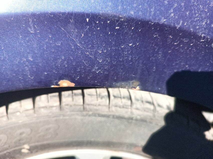 Missing washer lid, dent in drivers front door, headlights are scratched, drivers front wing has rust, general wear and tear