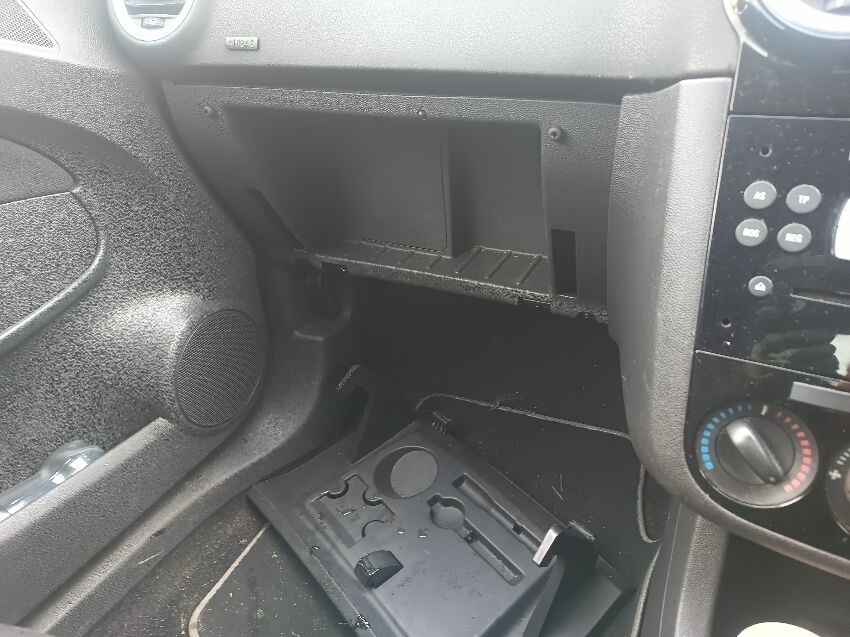 Broken glove box, damaged passenger side taillight, damaged & loose rear bumper, general wear and tear.