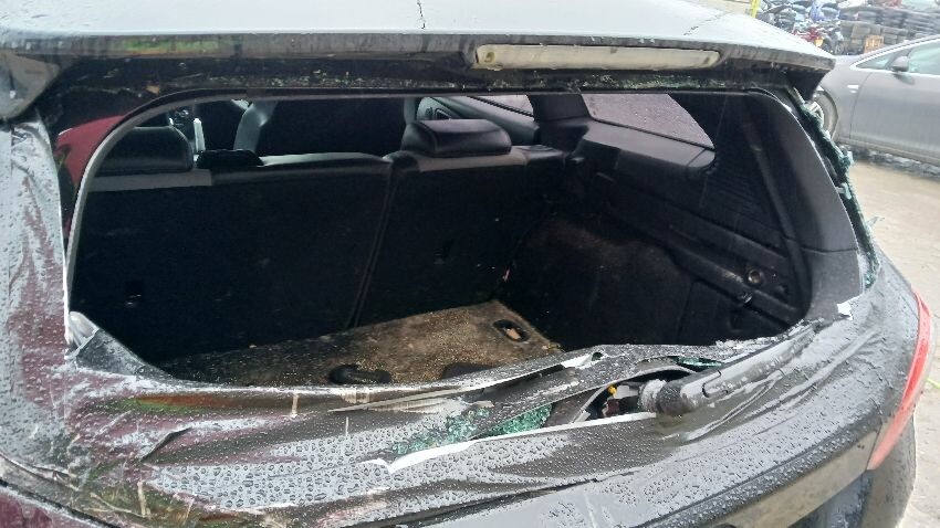 Front bumper, front windscreen smashed, ns front wing, ns front door, ns rear quarter, rear bumper, boot lid, rear windscreen smashed, os complete, os front door doesn't close, scuffs and scratches all over, general wear and tear for age and mileage