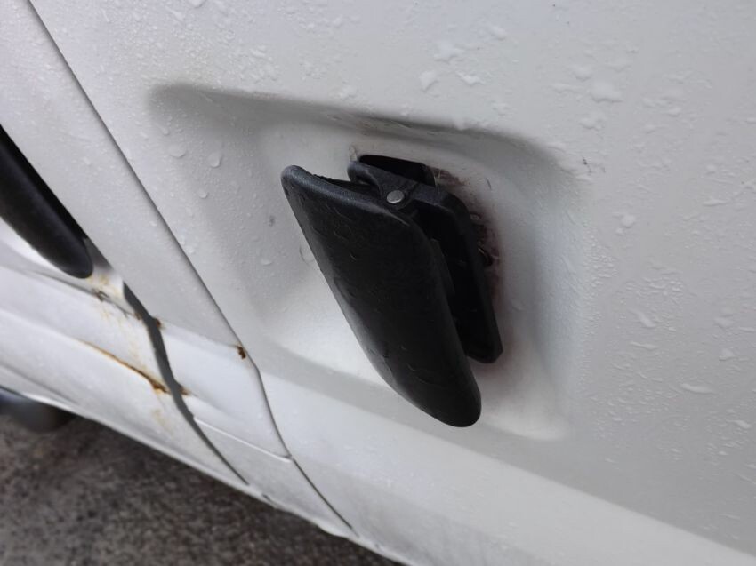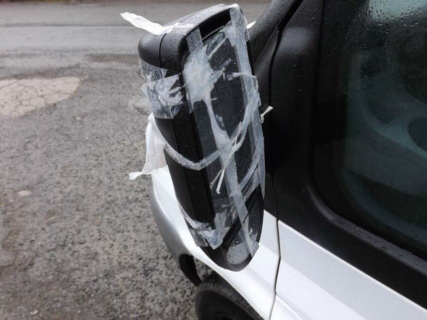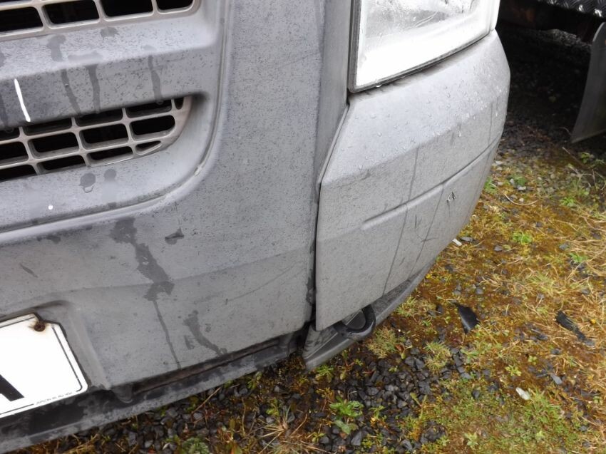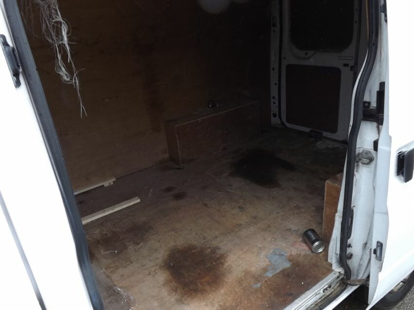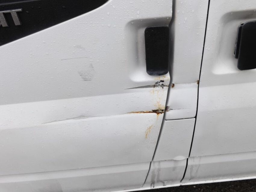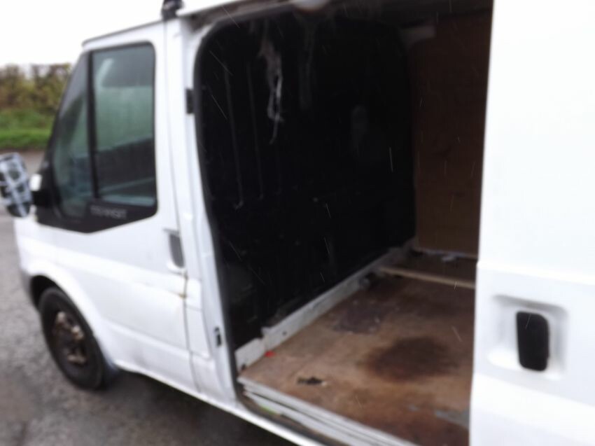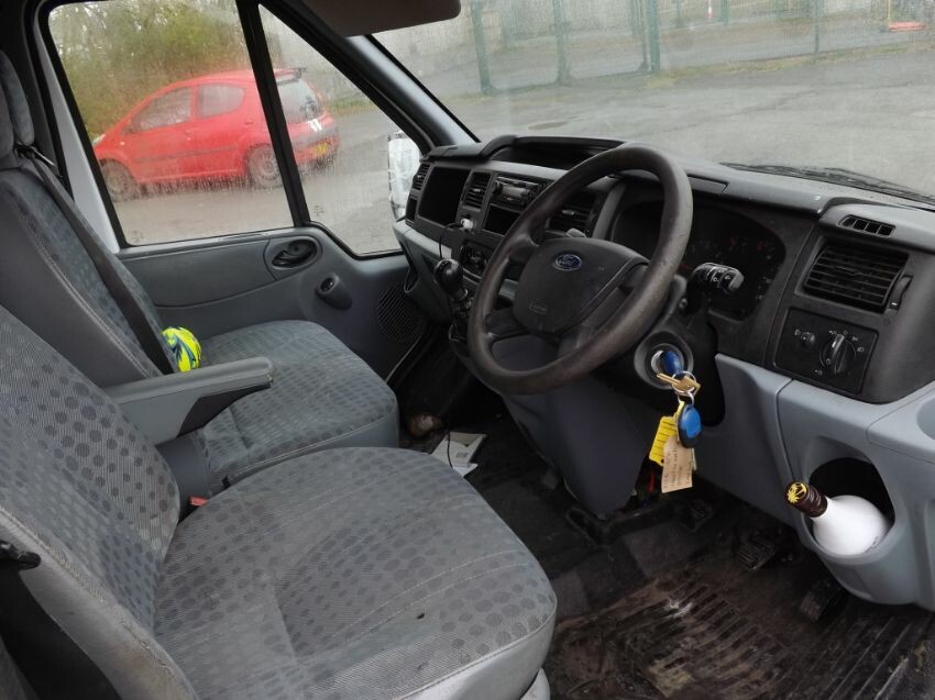 Damage to nearside mirror, n/s/front door, "b"-post (superficial), n/s/front bumper corner loose, and large areas of paintwork not original. some rust. rear door locked. side loading door handle loose but operates. cab interior worn.