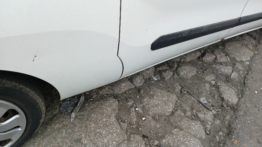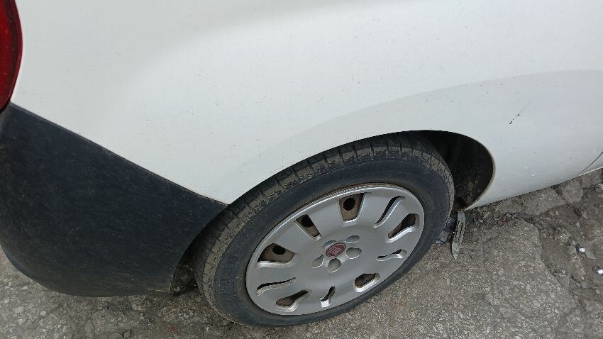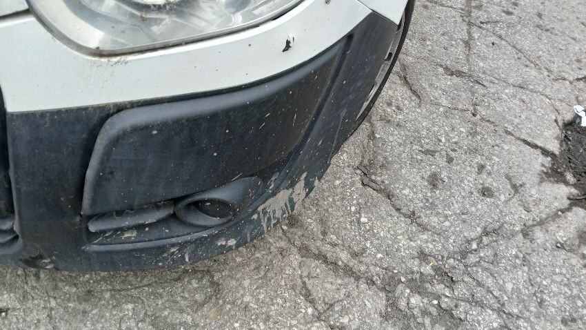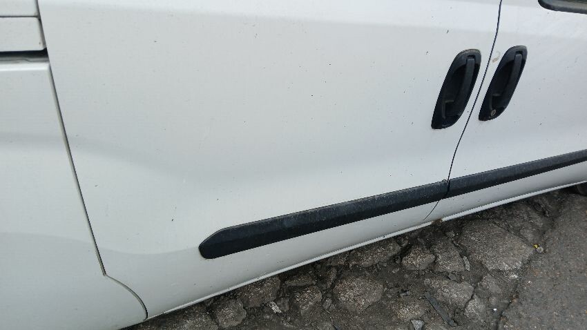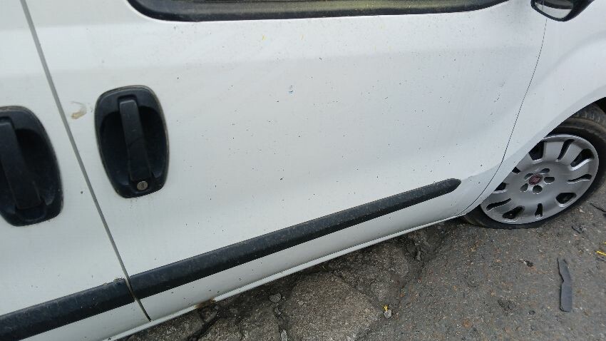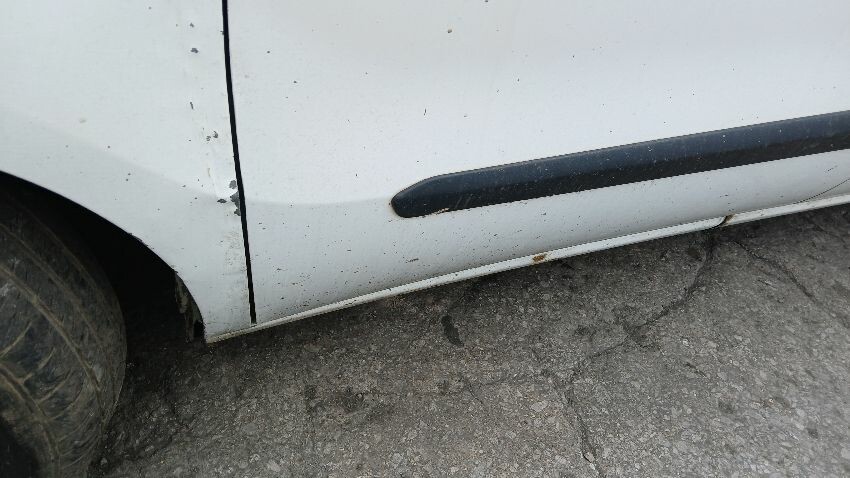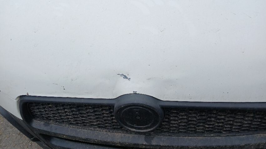 Front bumper, bonnet, n/s front wing, n/s sill, o/s rear quarter, rear bumper, both rear doors, o/s rear quarter, o/s sill, o/s door, o/s wing mirror, scuffs and scratches all over, age and mileage related wear and tear, areas of rust throughout