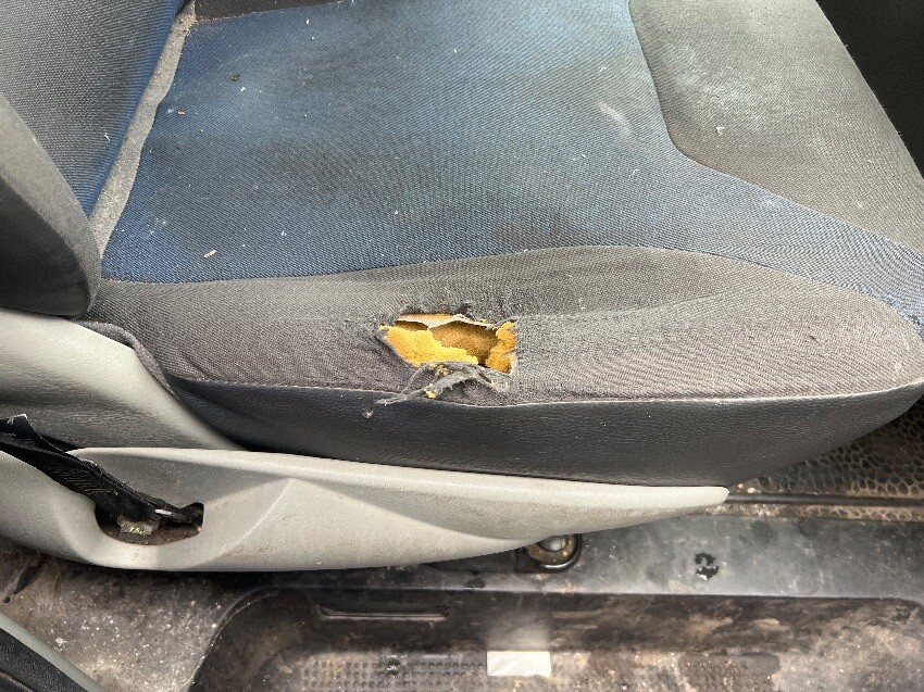 Rear bumper, rear light, offside side panel, driver seat, window screen, offside passenger door window, offside wing mirror, offside front wing, front bumper, bonnet, headlight, nearside front wing, nearside front passenger door, nearside wing mirror, nearside side door, nearside rear wheel arch, general wear and tear.