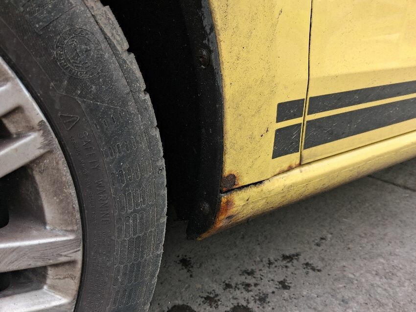 O/s/f door damaged, o/s/r door damaged, o/s/r panel rusting, n/s wing mirror damaged, n/s/f wing rusting, n/s sill cover rusting, general wear and tear,