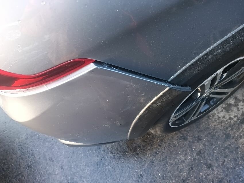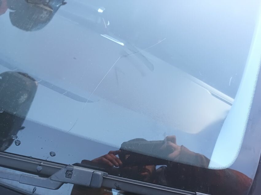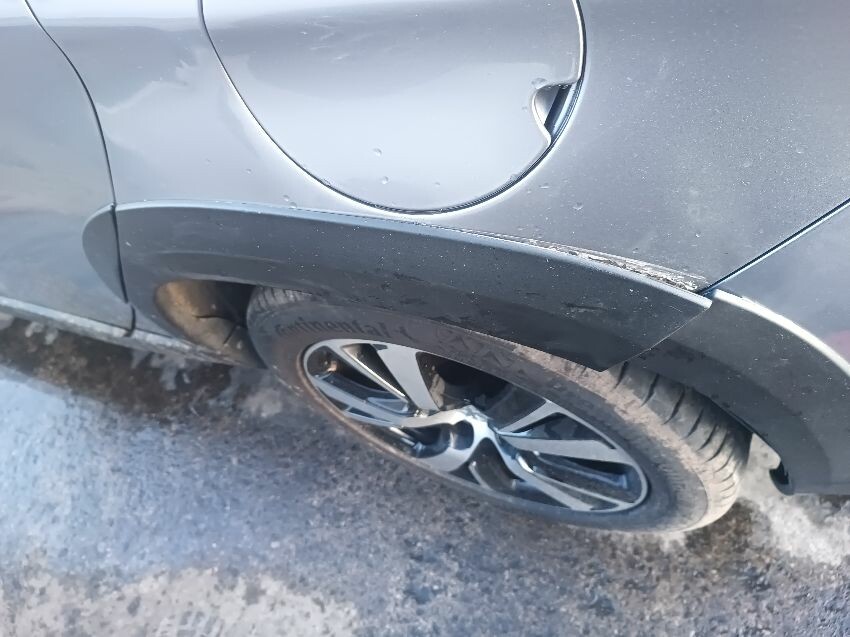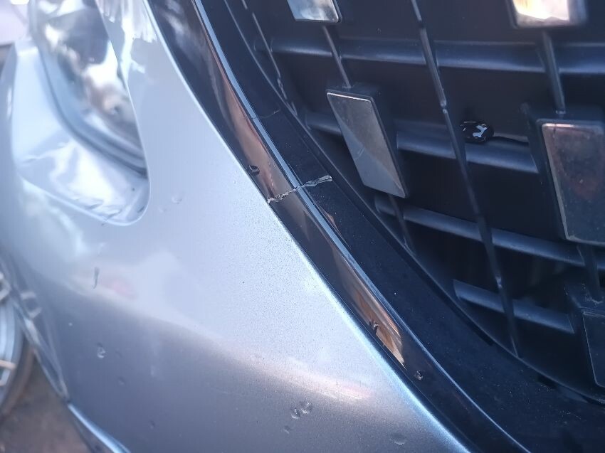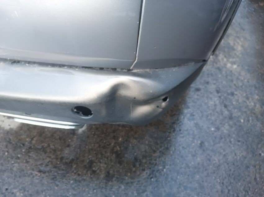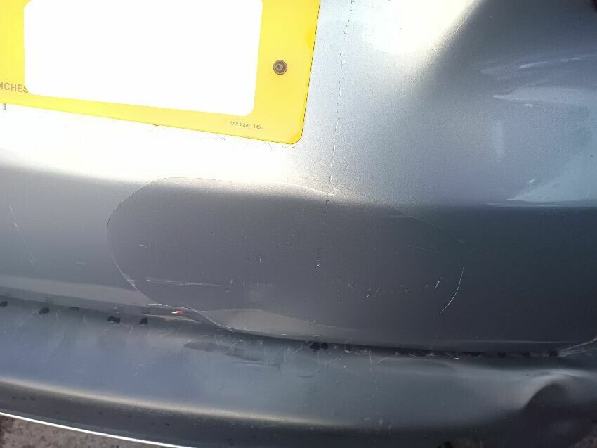 Rear bumper bent, rear hatch dented, trim loose, front bumper damaged & loose, rear bumper loose, window washer spray nozzle loose, windscreen cracked, general wear and tear