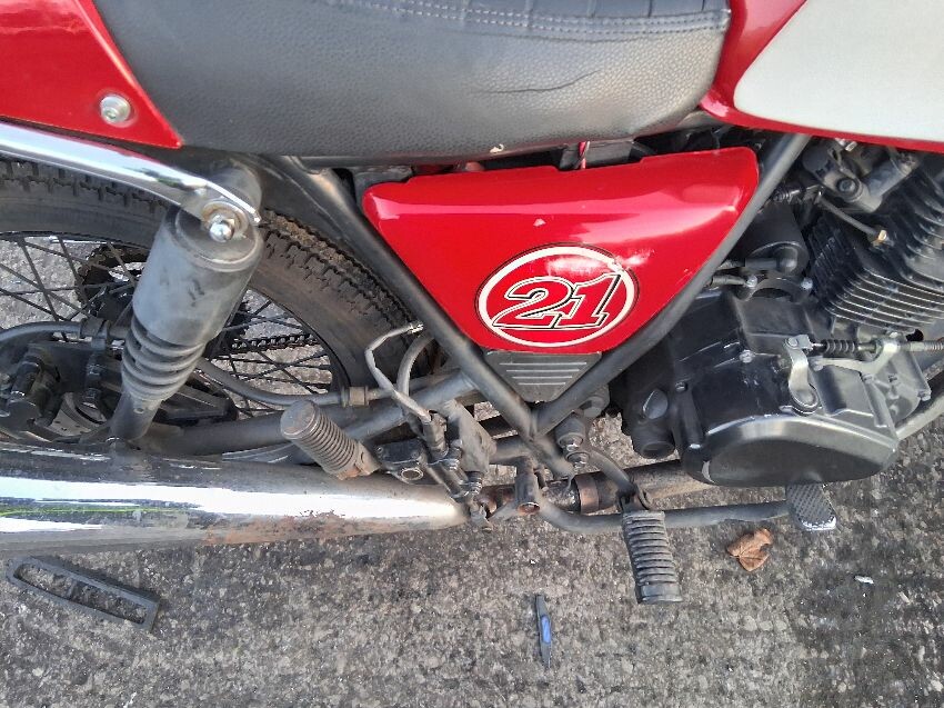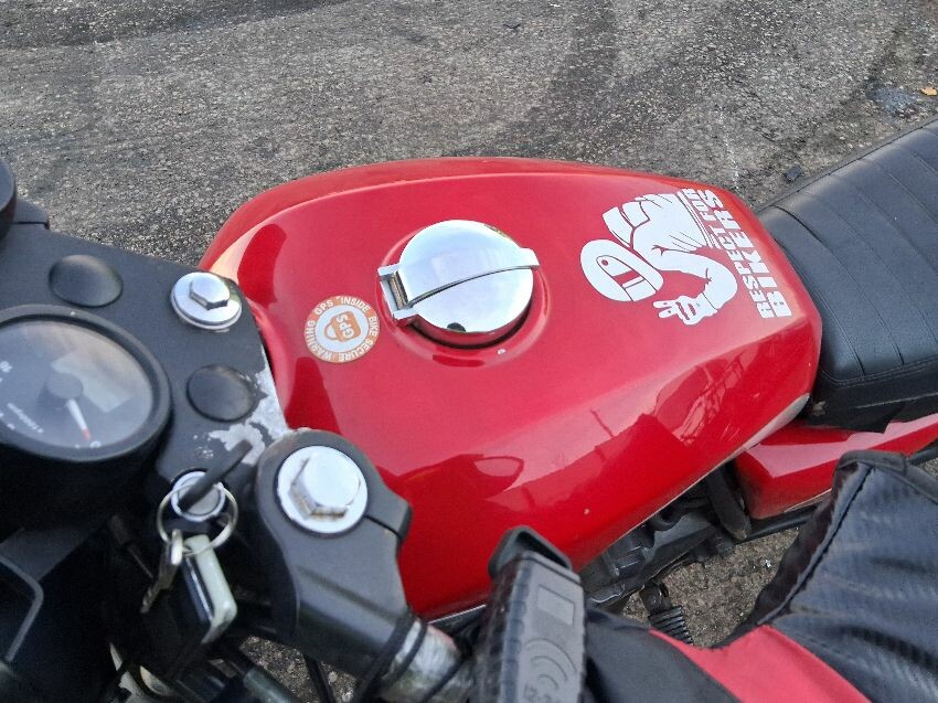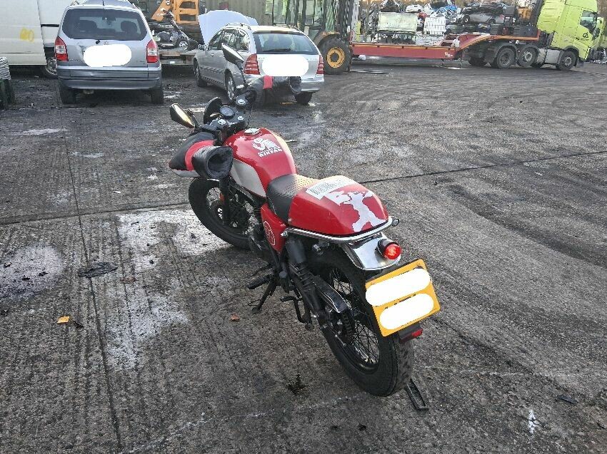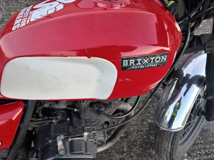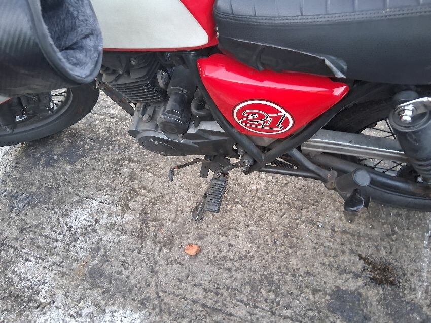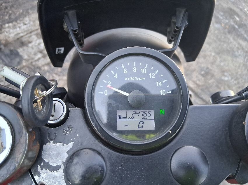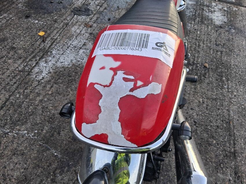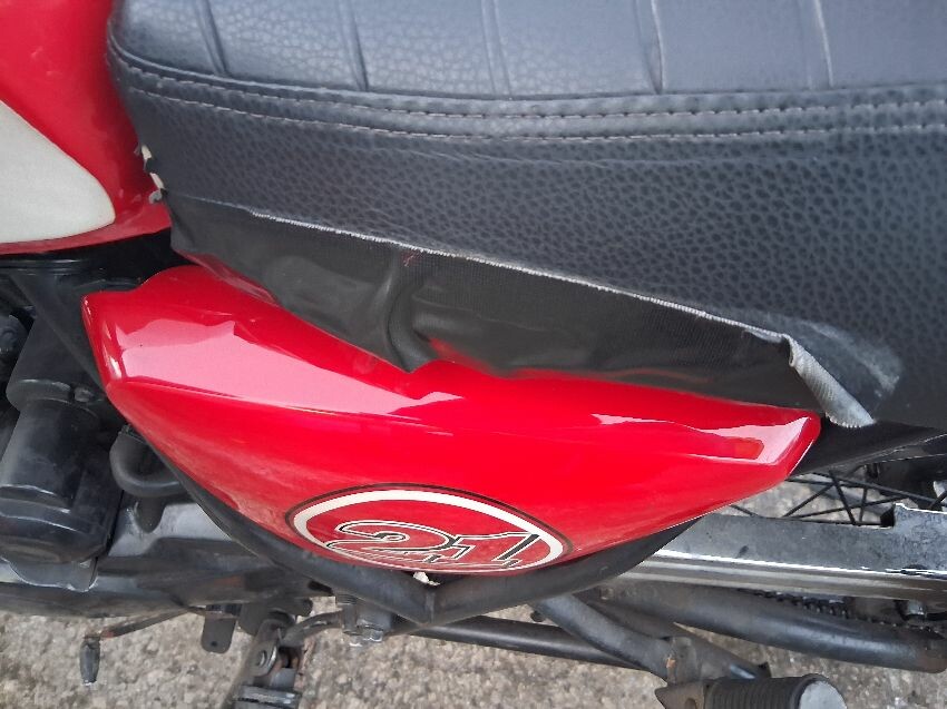 Very low on fuel, rear plastics, fuel tank, seat torn, front unit, rust visible on bike, general wear and tear and scratches.
