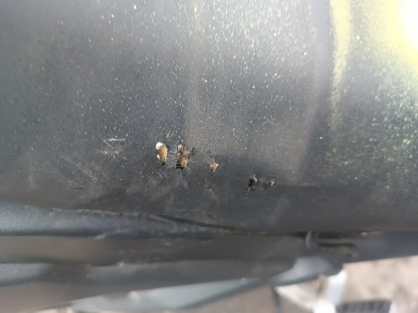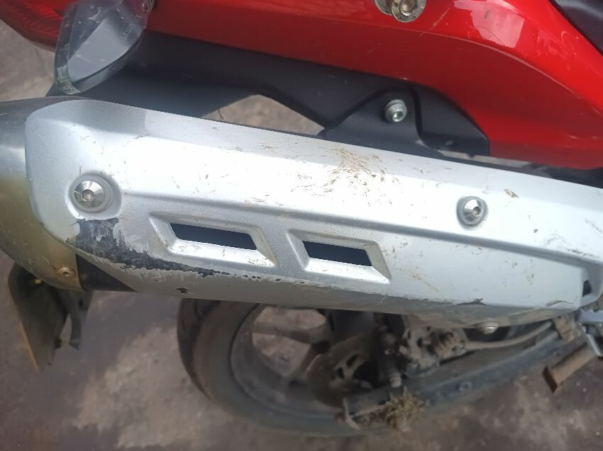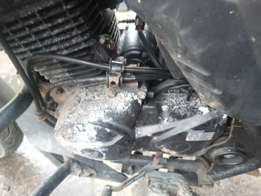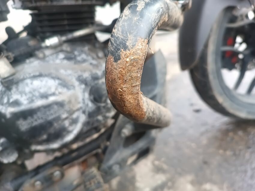Torn seat, corroded engine casing, rusting/damaged engine guard, exhaust shielding damaged, general wear & tear