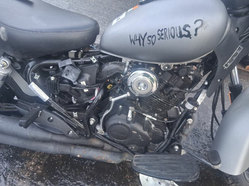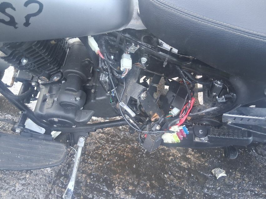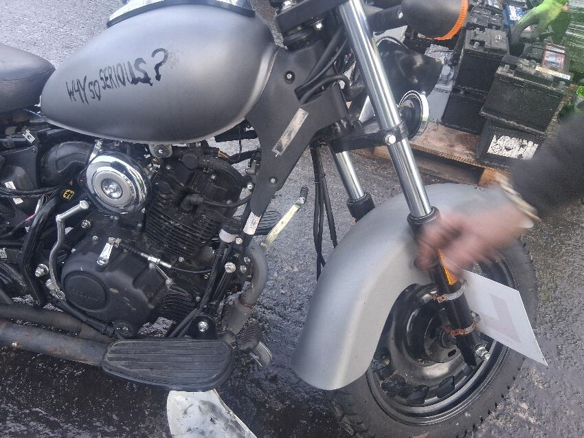 No keys hence no image of clocks, frame both sides has damage, various panels missing, seat not fixed in place, front unit, headlight missing, wiring tampered, fuel tank, general wear and tear and scratches.