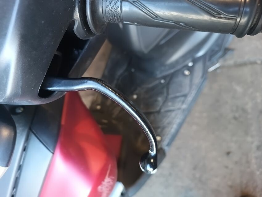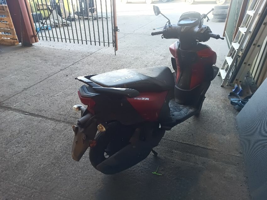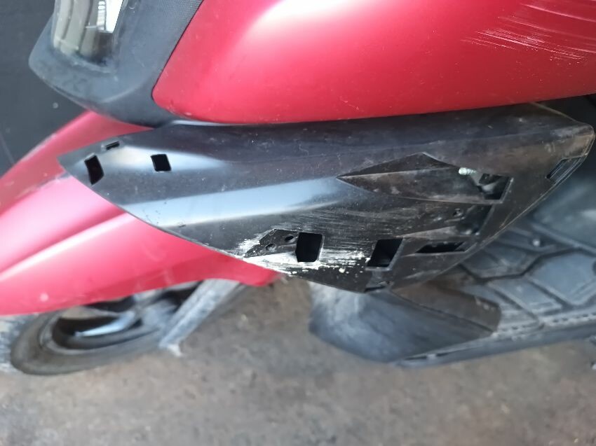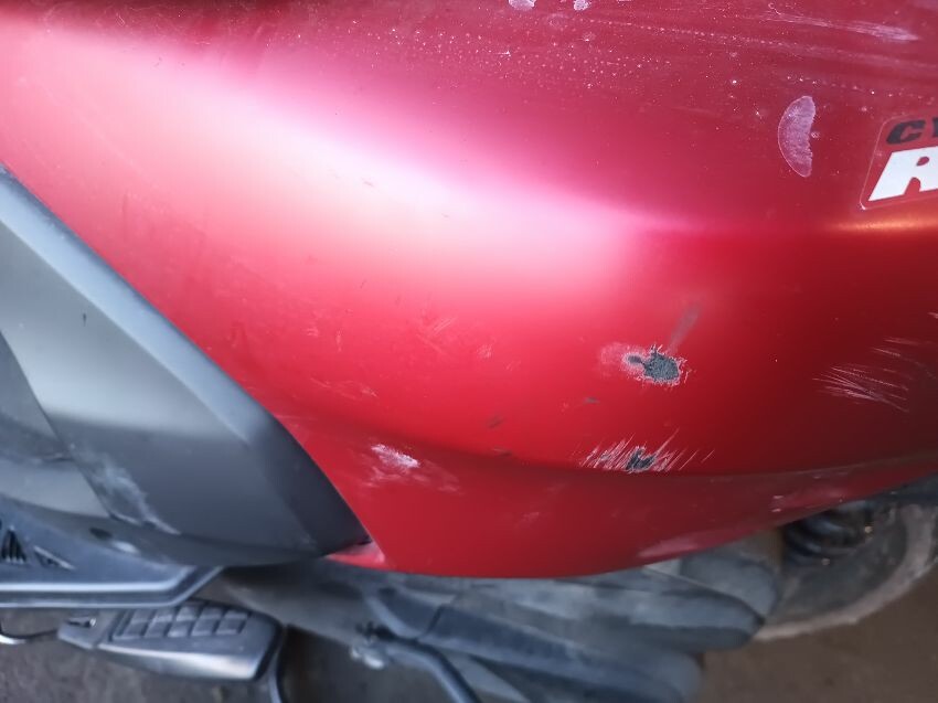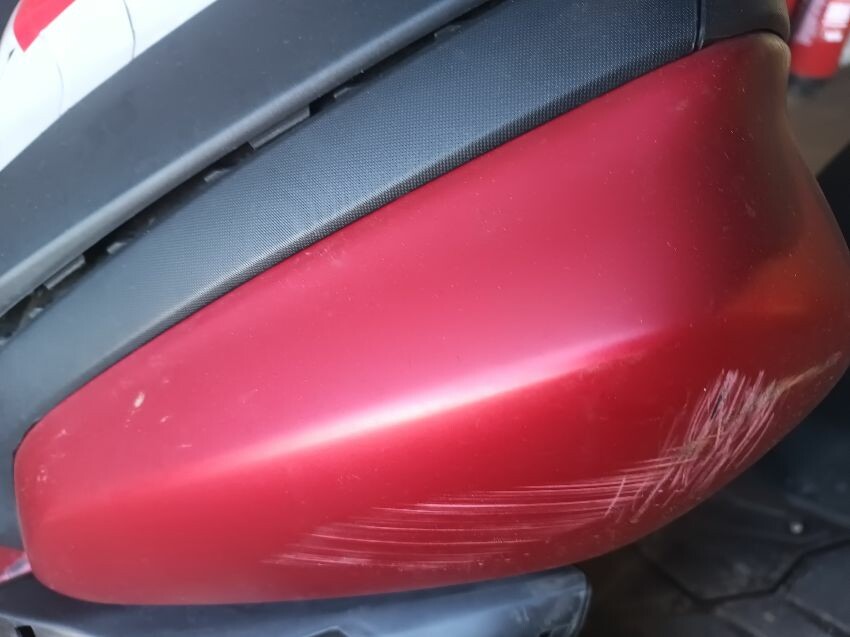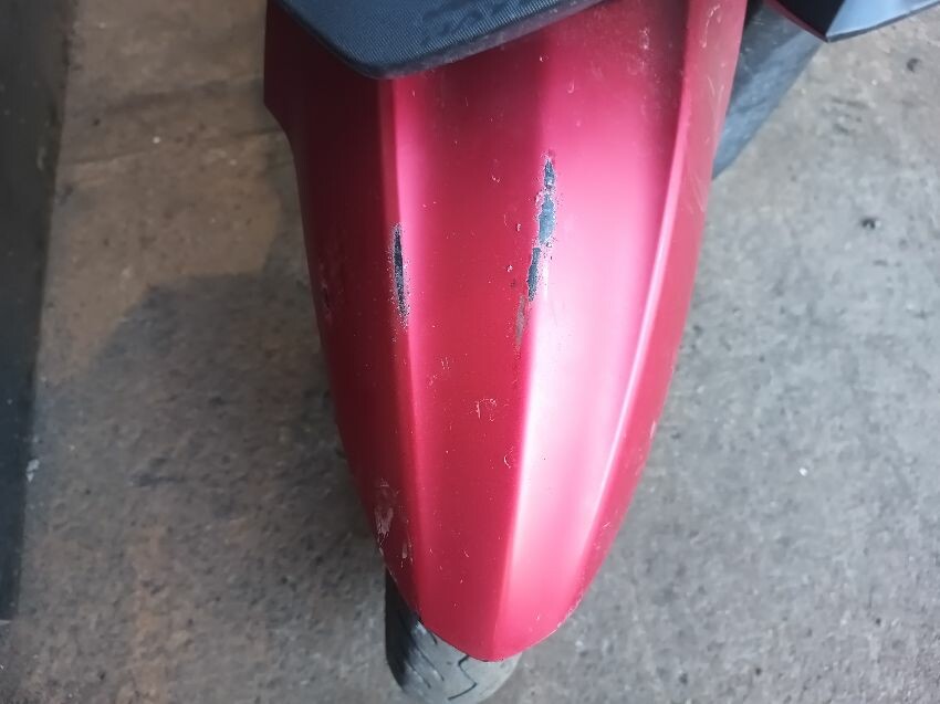 Front fender is scuffed, front plastics are scratched, left brake lever is bent, left front trim is missing, seat plastics are scuffed, paint has rubbed off on the grab rails, right mirror is broken,