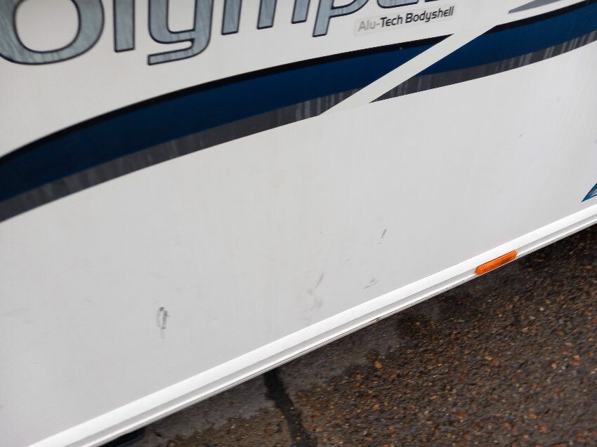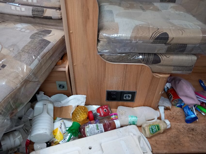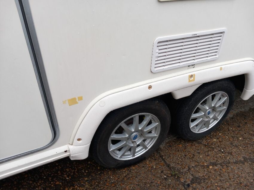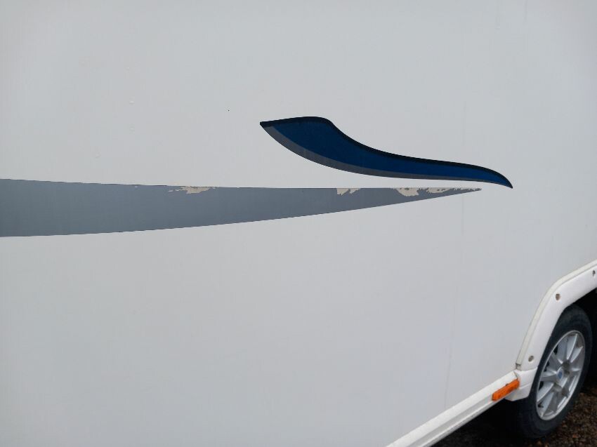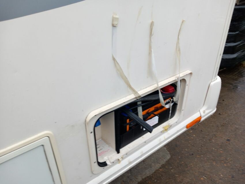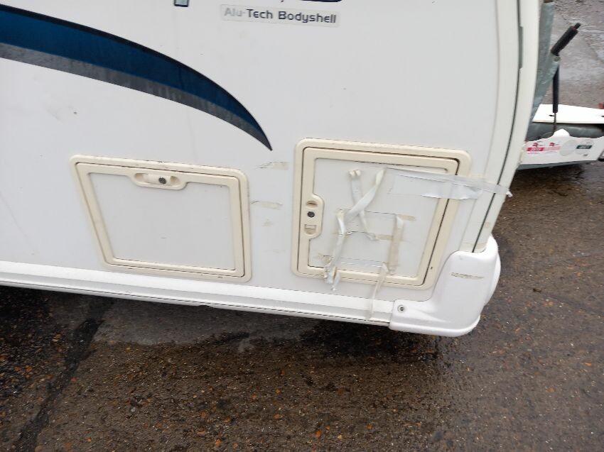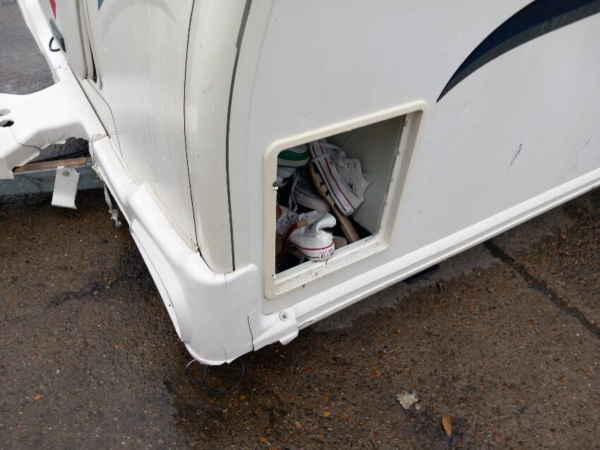 N/s, o/s, towing hook cover, some missing exterior covers, interior has been pulled out but majortity of cushions etc still have plastic wrapping on. some old food has been left in it previously so there is an awful smell inside, door handle broken.