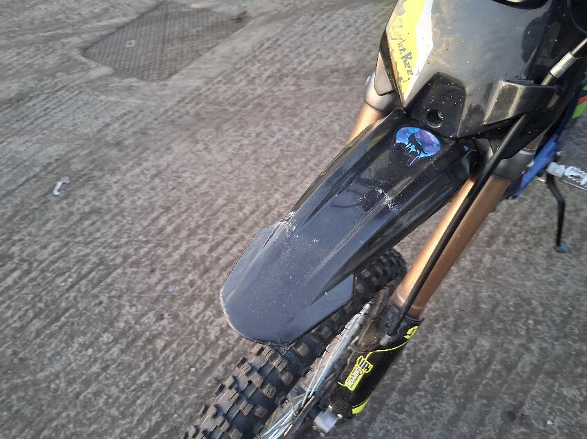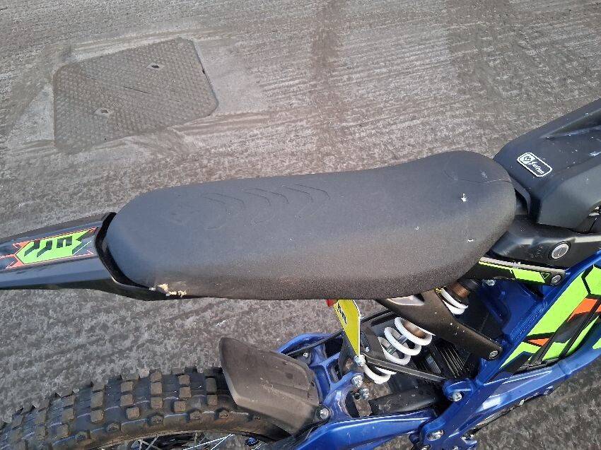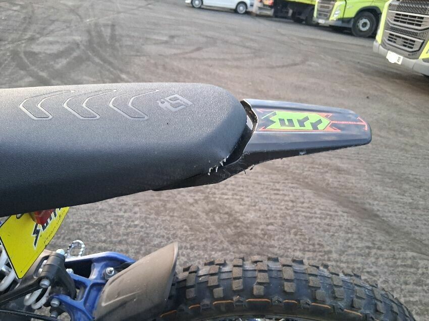 Seat torn, frame both sides have damage, rear mudguard, both brake levers, off road use visible, general wear and tear and scratches.