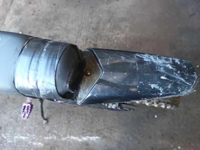 Seat torn, rear mudguard is loose, rear tyre is bald, foorpegs are scuffed & worn, handlebars ends are damaged, grips are damaged, digital tachometer screen is broken, front & rear brakes don't work, rear brake master cylinder is damaged & the lever is damaged, front brake levers is bent & scuffed, frame is scuffed, general wear and tear.