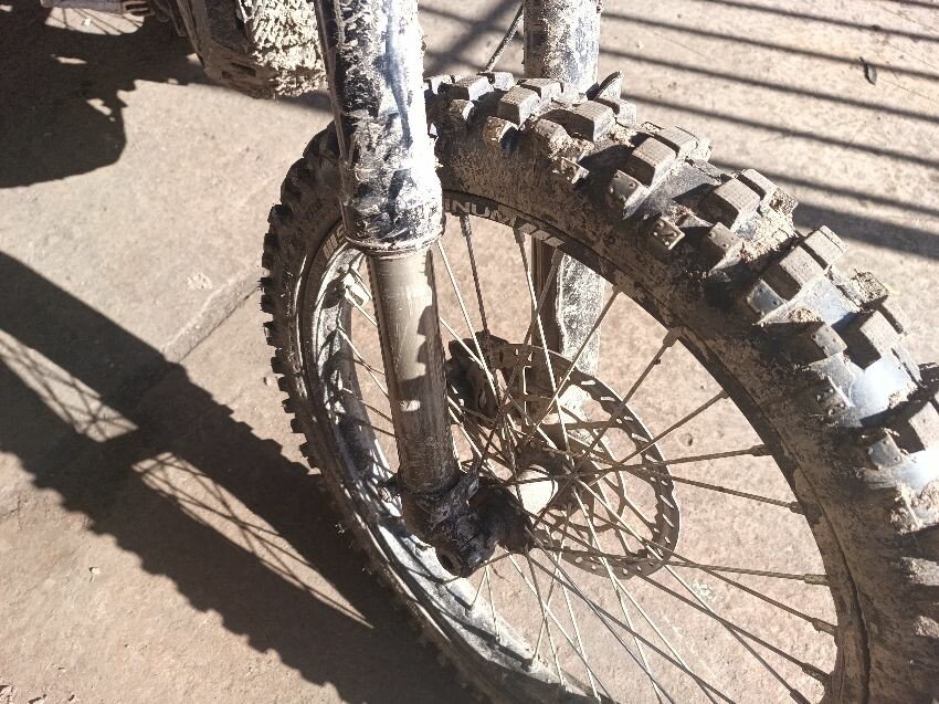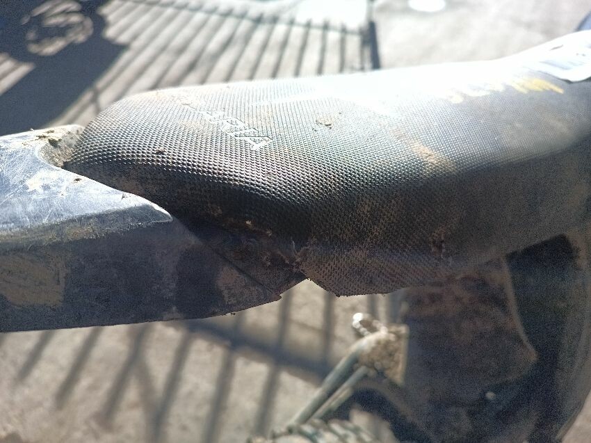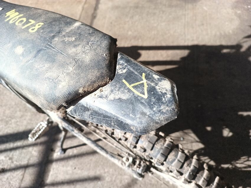 Front fender missing. rear fender scuffed seat torn, missing right fork guard, brakes are spongy general wear and tear.