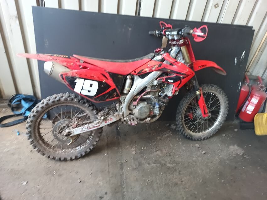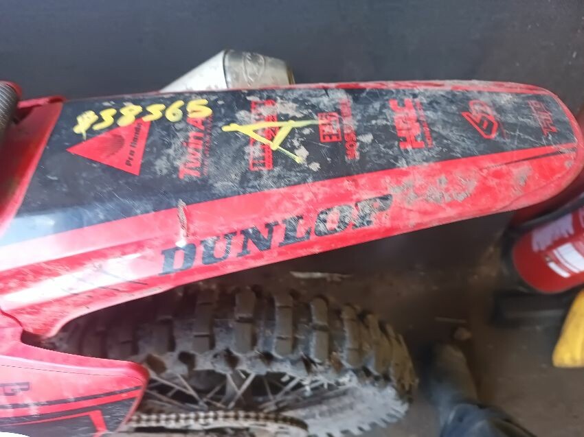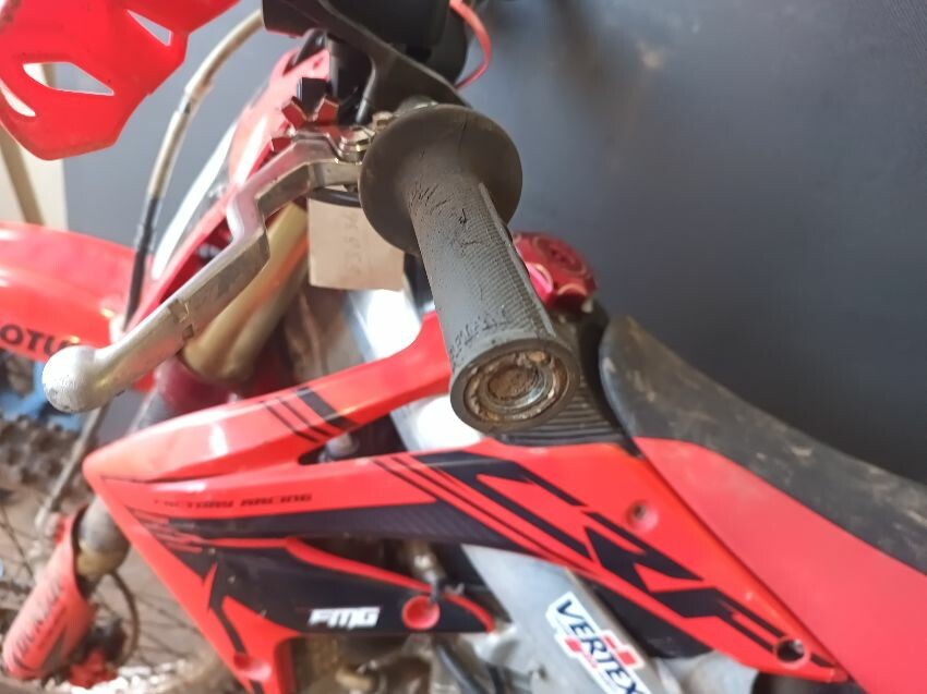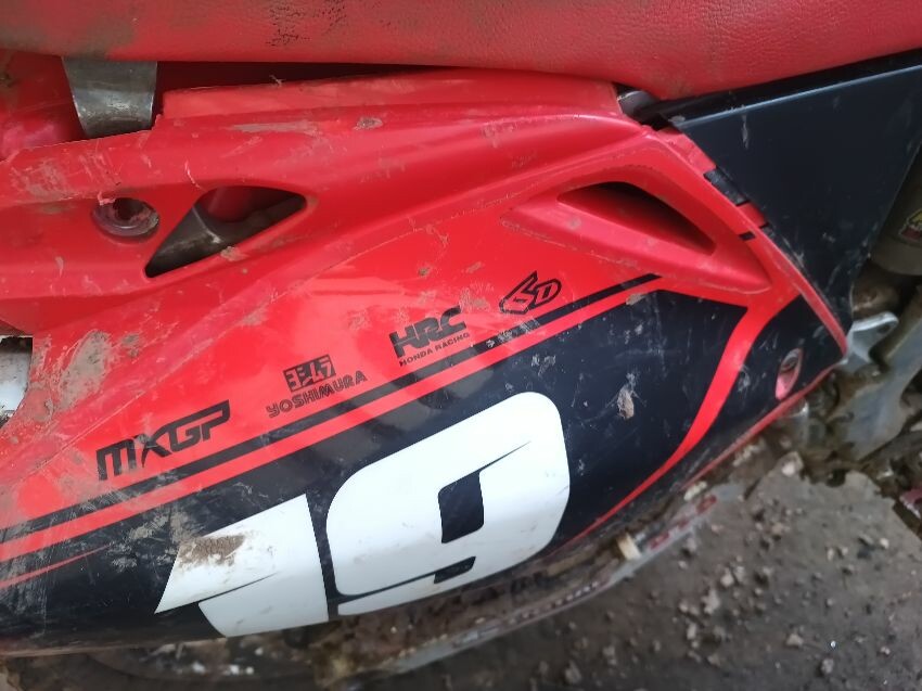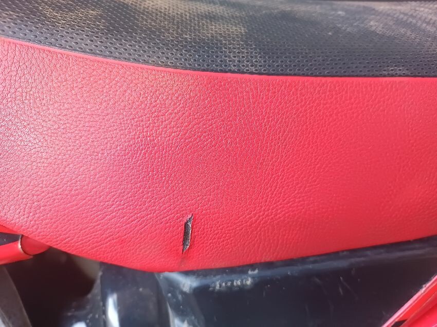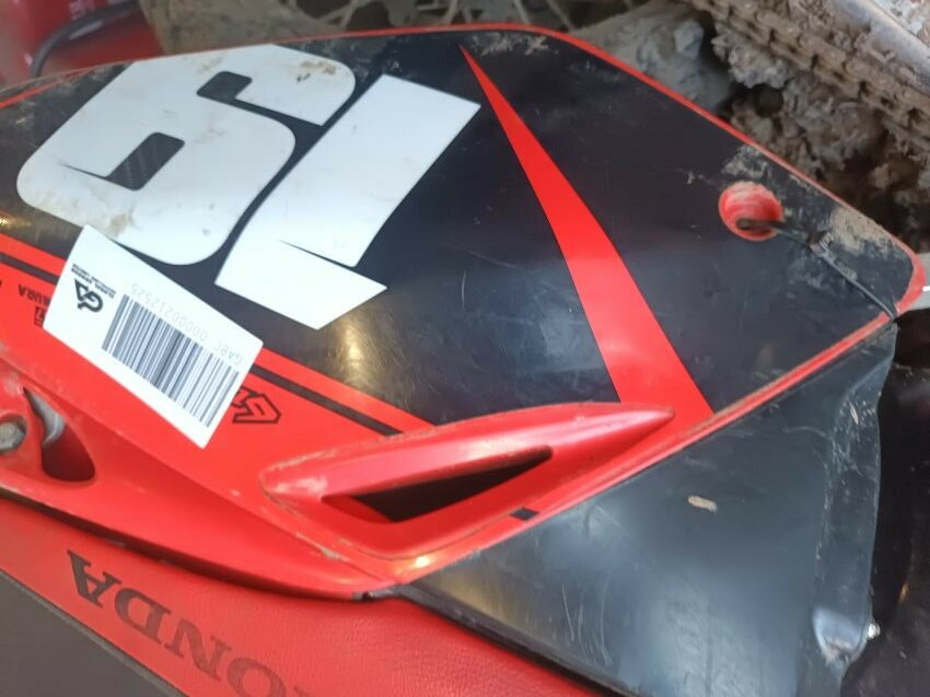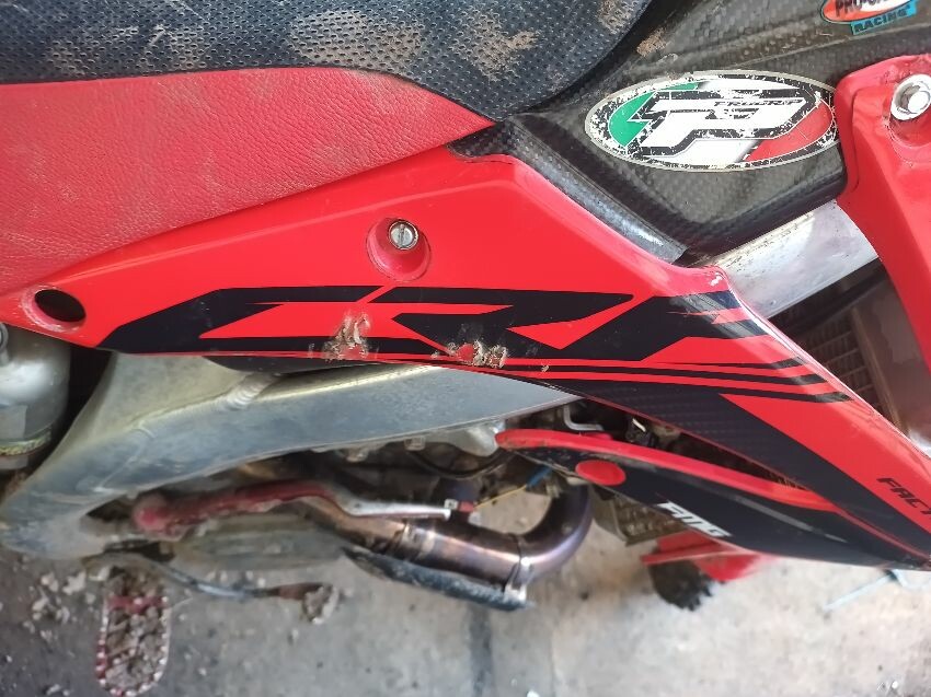Rough idle, seat torn, left tank plastics are loose & missing bolts, left seat plastics are loose & missing a bolt, rear mudguard is damaged, handle bar ends are damaged, right tank plastics are scuffed, right seat plastics are loose & missing a bolt, general wear and tear.