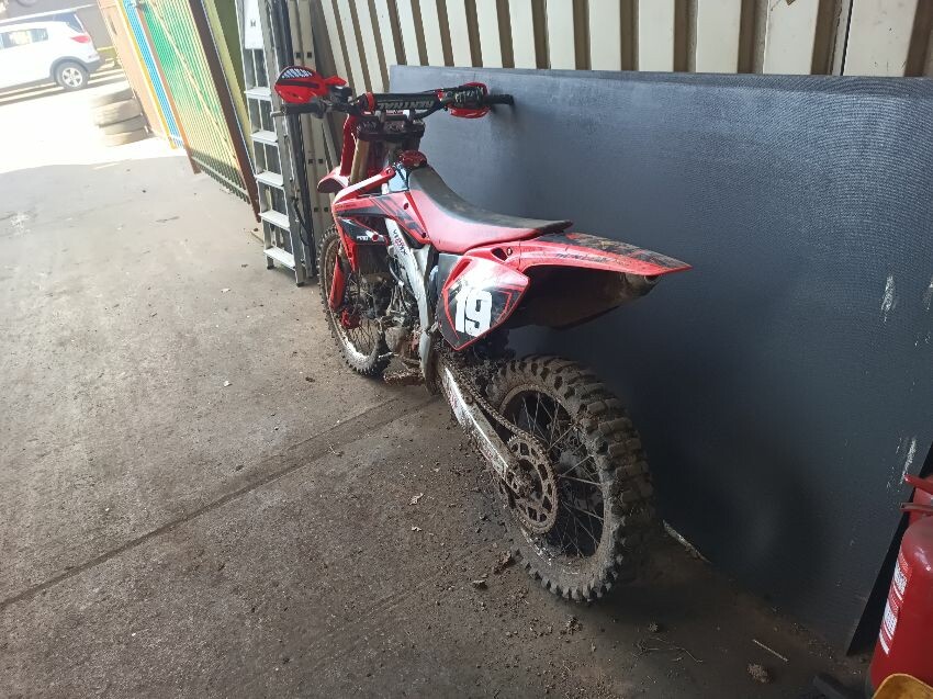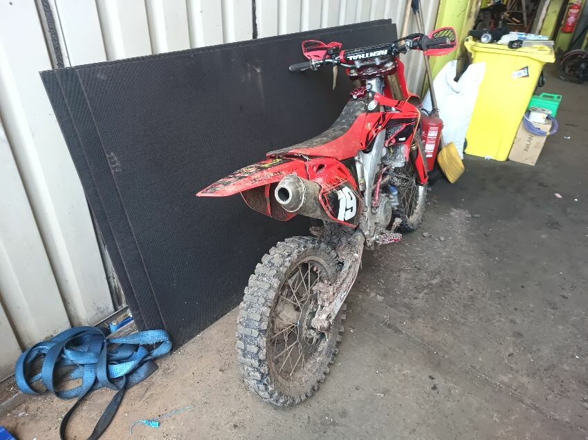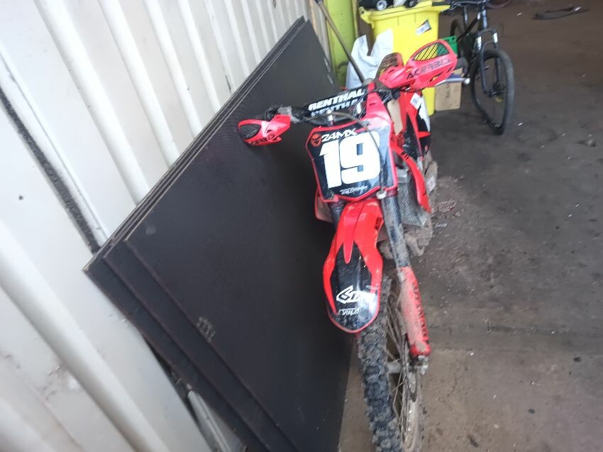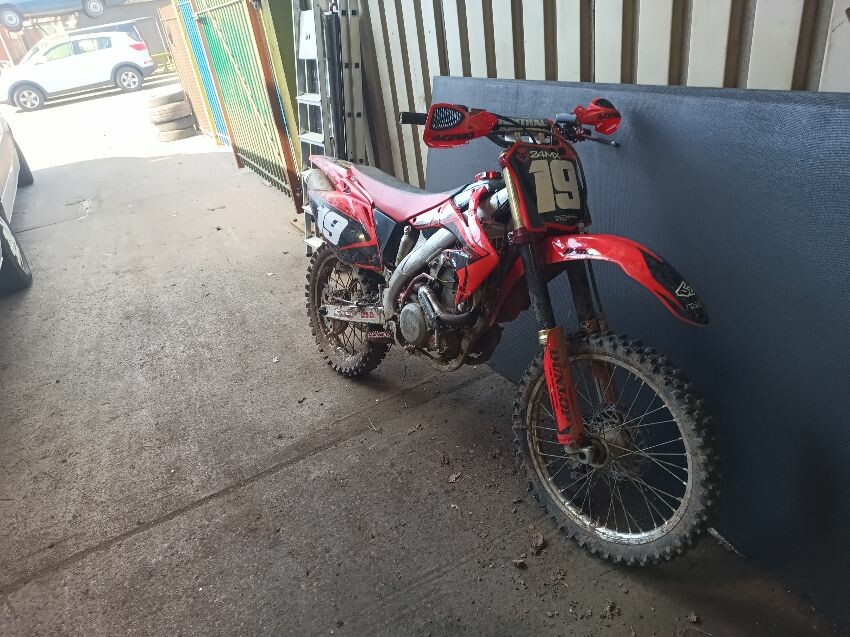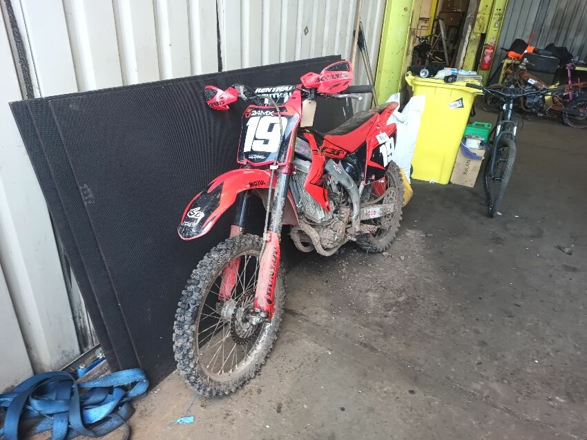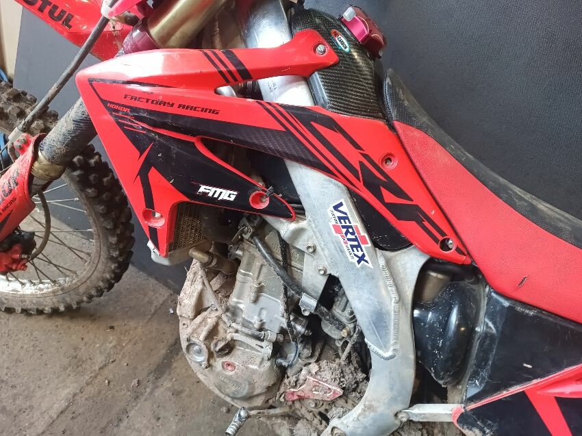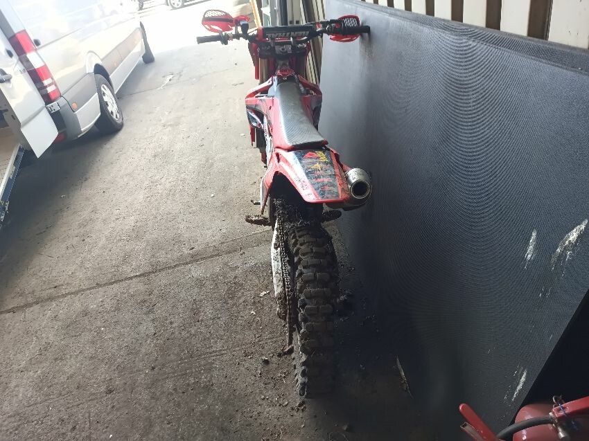 Rough idle, seat torn, left tank plastics are loose & missing bolts, left seat plastics are loose & missing a bolt, rear mudguard is damaged, handle bar ends are damaged, right tank plastics are scuffed, right seat plastics are loose & missing a bolt, general wear and tear.