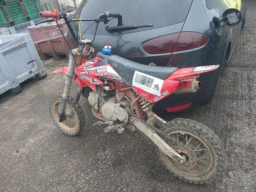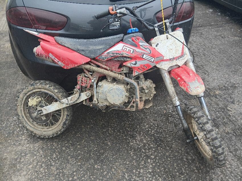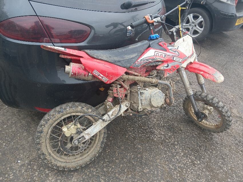 Forks twisted, hole in engine, brakes dont work, off road use visible, general wear and tear