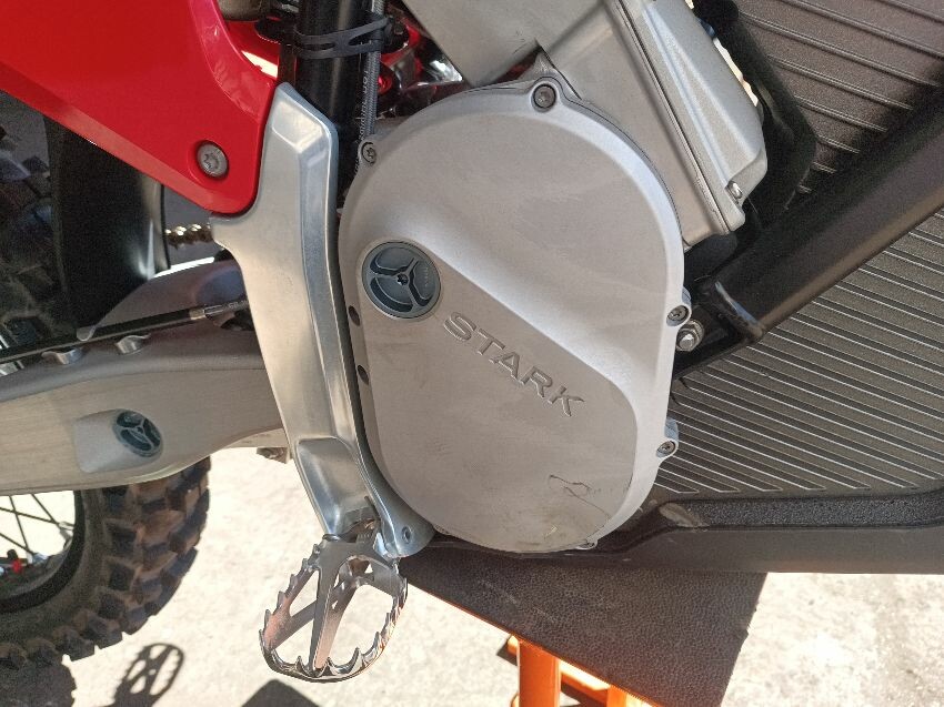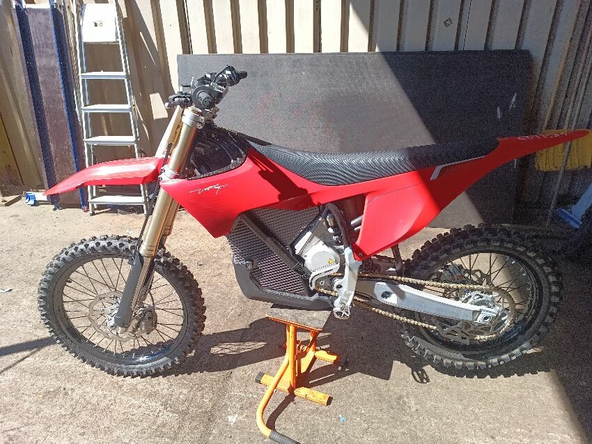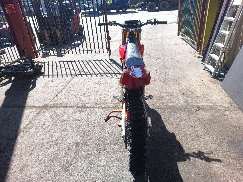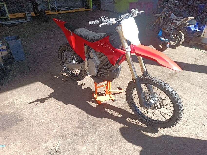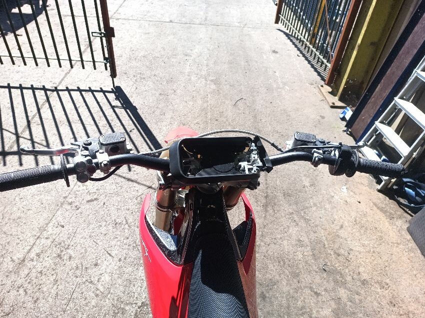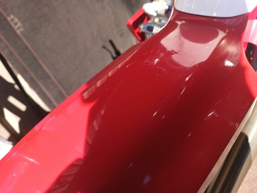 Missing screen, scuff on rear mud guard, scuff on front mudguard, right grip is damaged, motor cover scratched, general wear and tear.