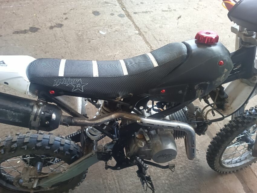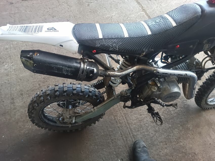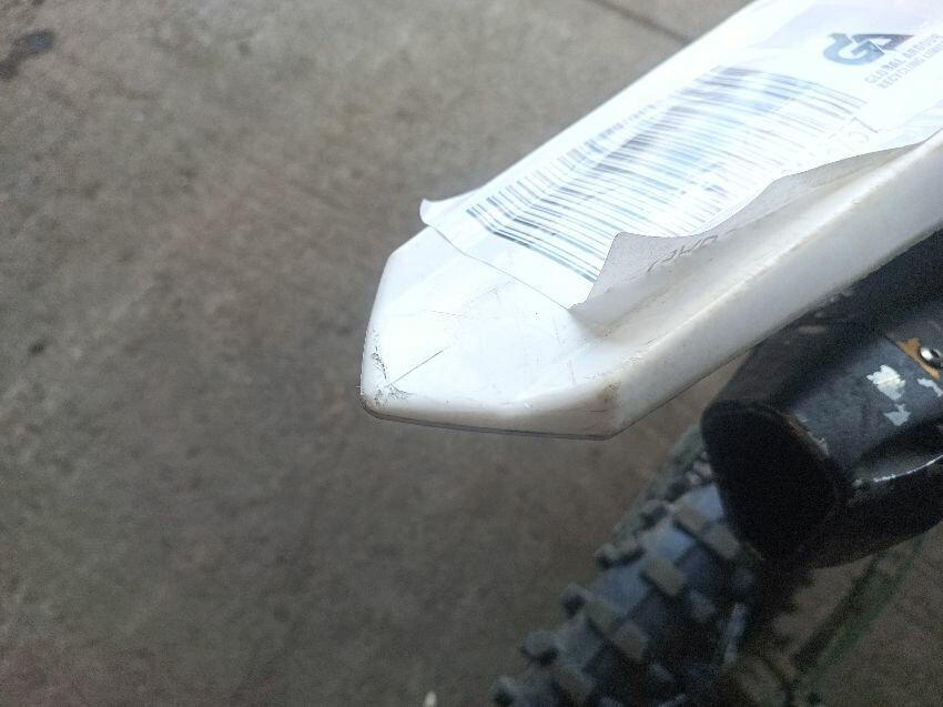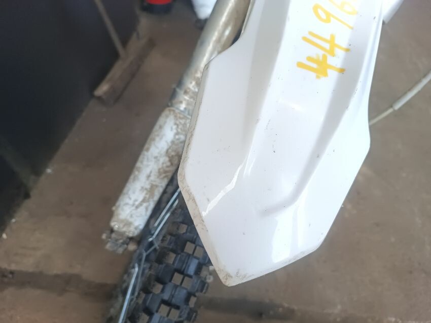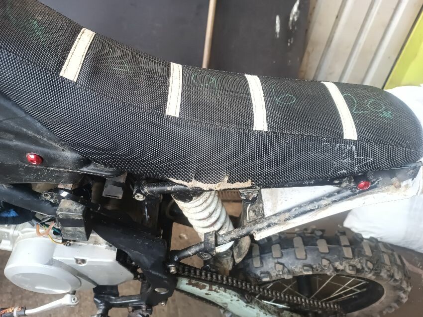 Torn seat, scuffed rear mudguard, scuffed front mudguard, missing under seat plastics, missing tank plastics, rusty exhaust, general wear and tear.