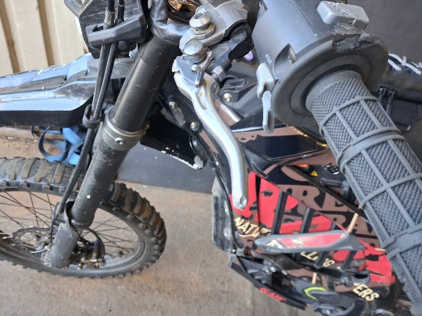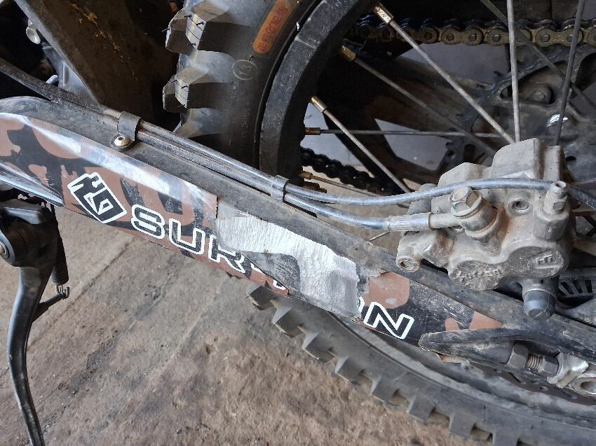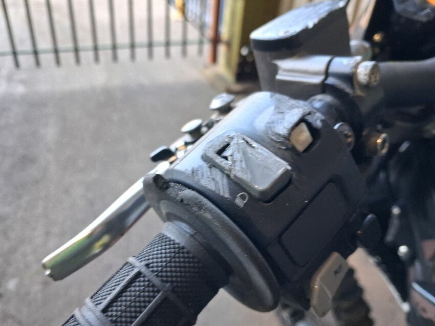 Front mudguard damaged, seat torn, swing arm damaged, brakes levers broken, light controls damaged, general wear and tear,