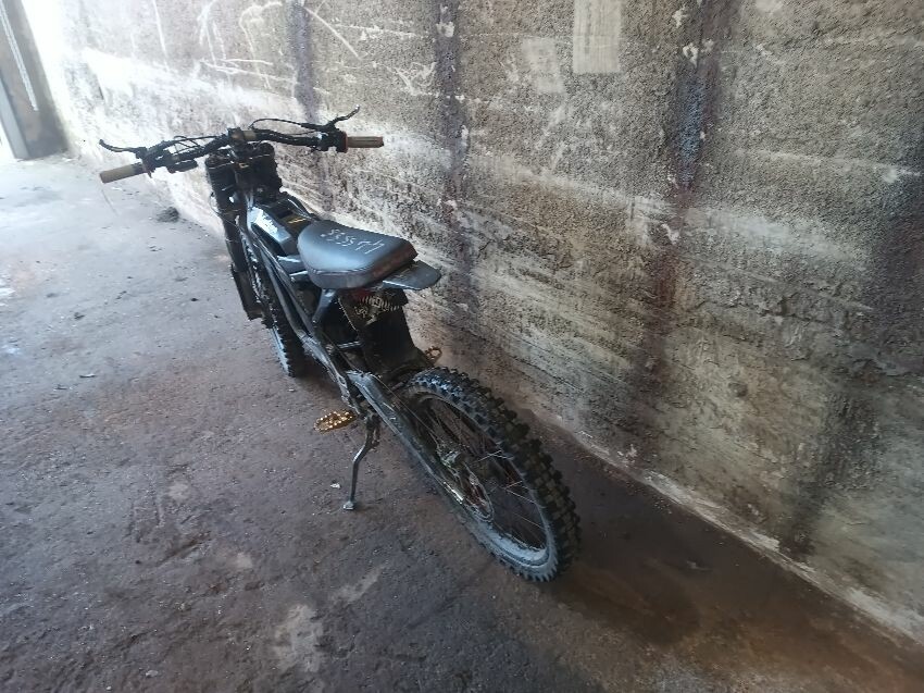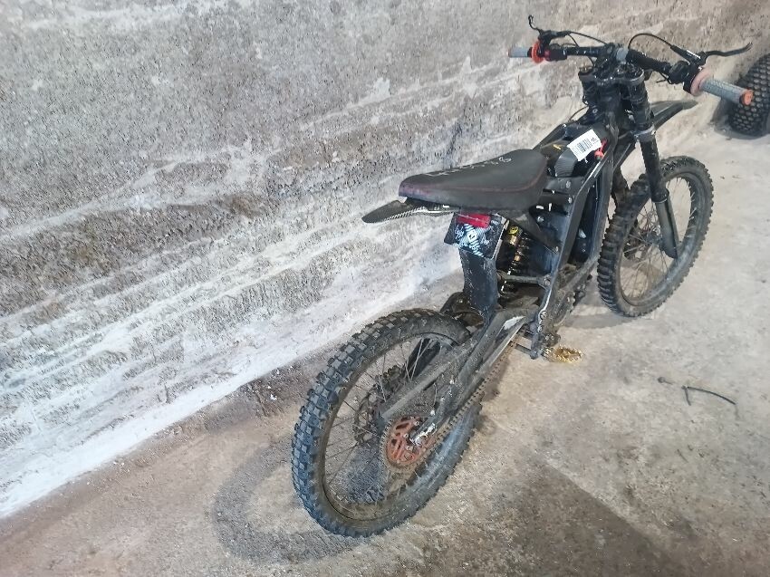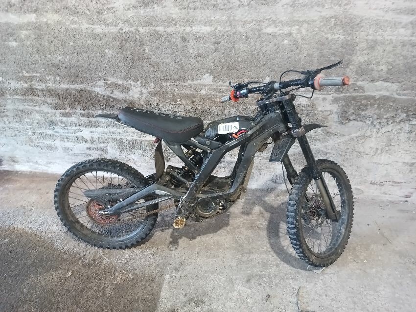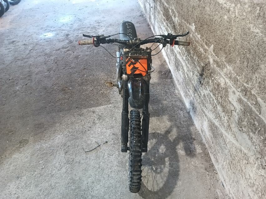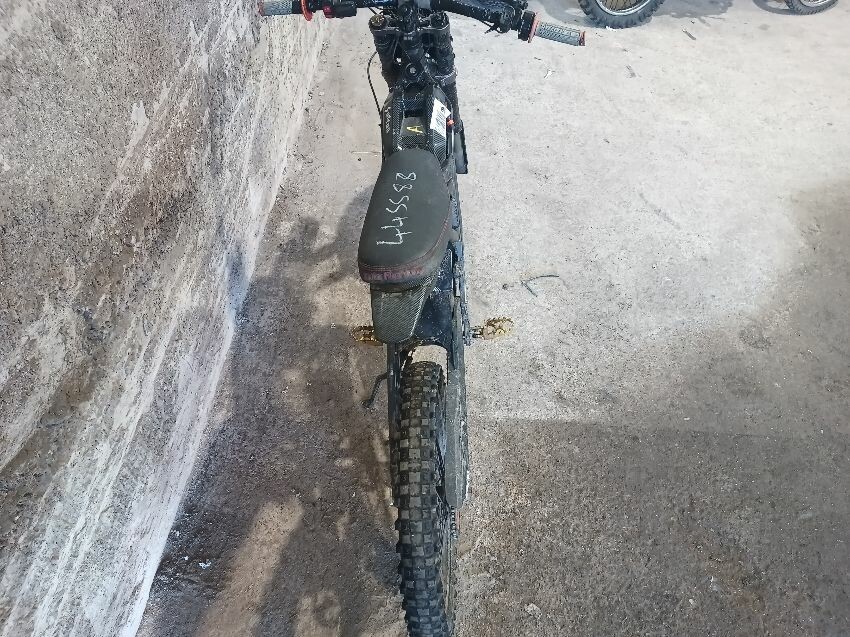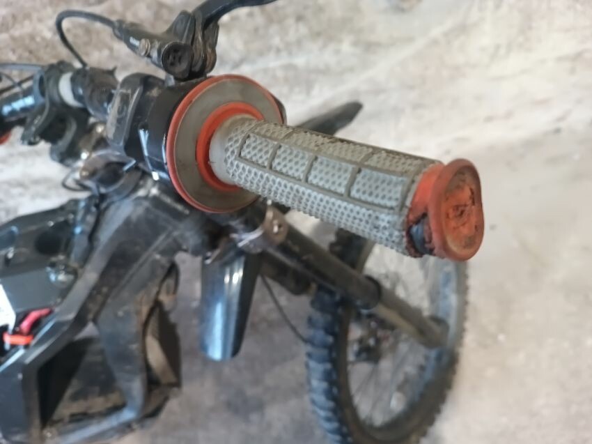 Handlebars loose, tape on handlebars, scuffed rear swing arm, scratched front fender, no battery, damaged battery latch, damaged twist grips, damaged brake levers, general wear & tear