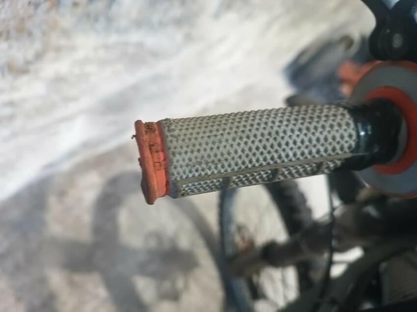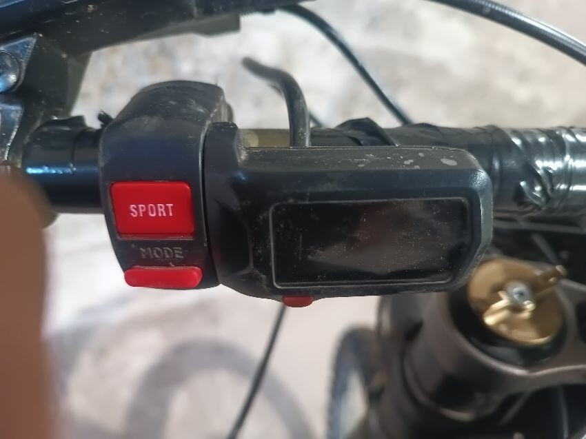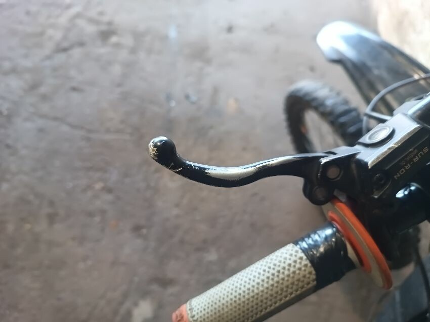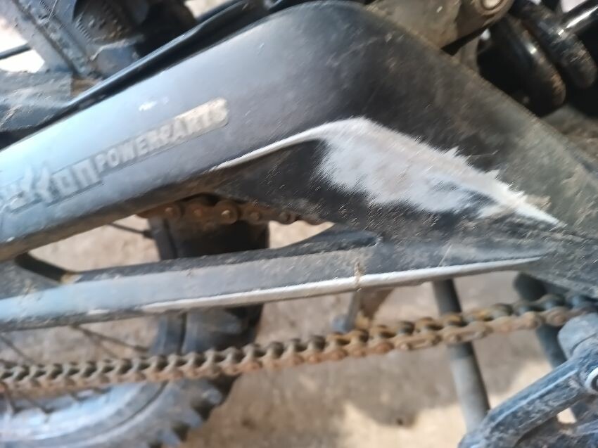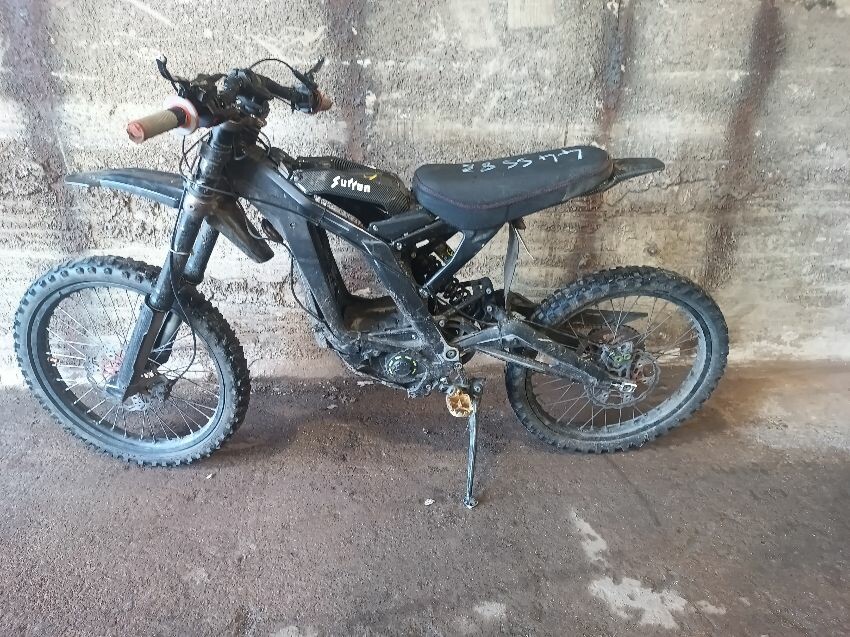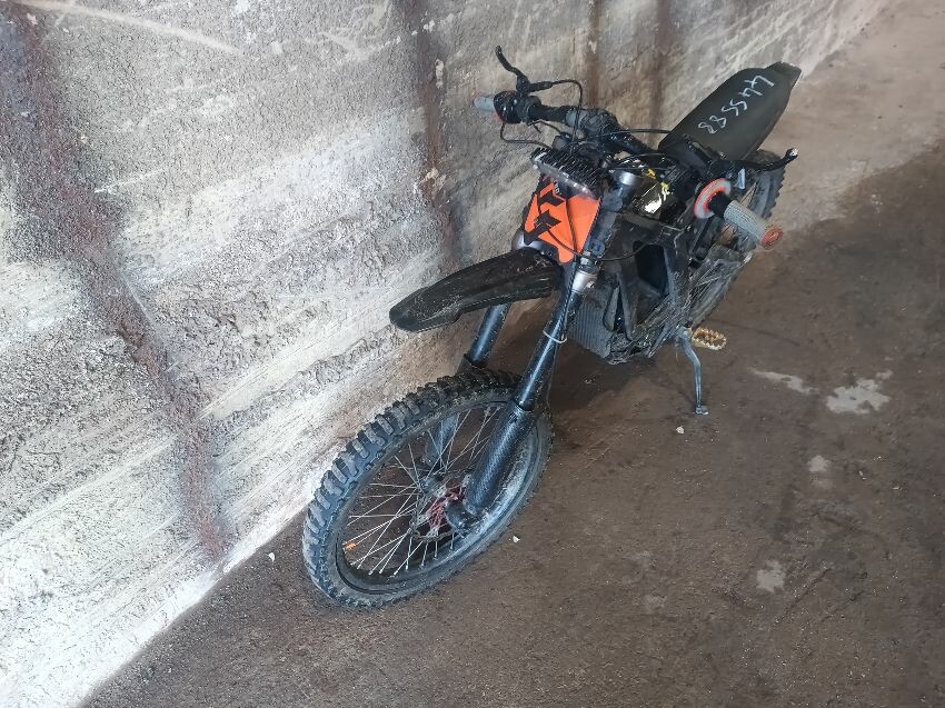 Handlebars loose, tape on handlebars, scuffed rear swing arm, scratched front fender, no battery, damaged battery latch, damaged twist grips, damaged brake levers, general wear & tear