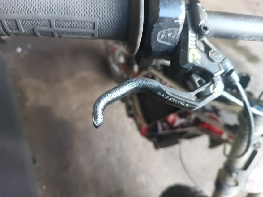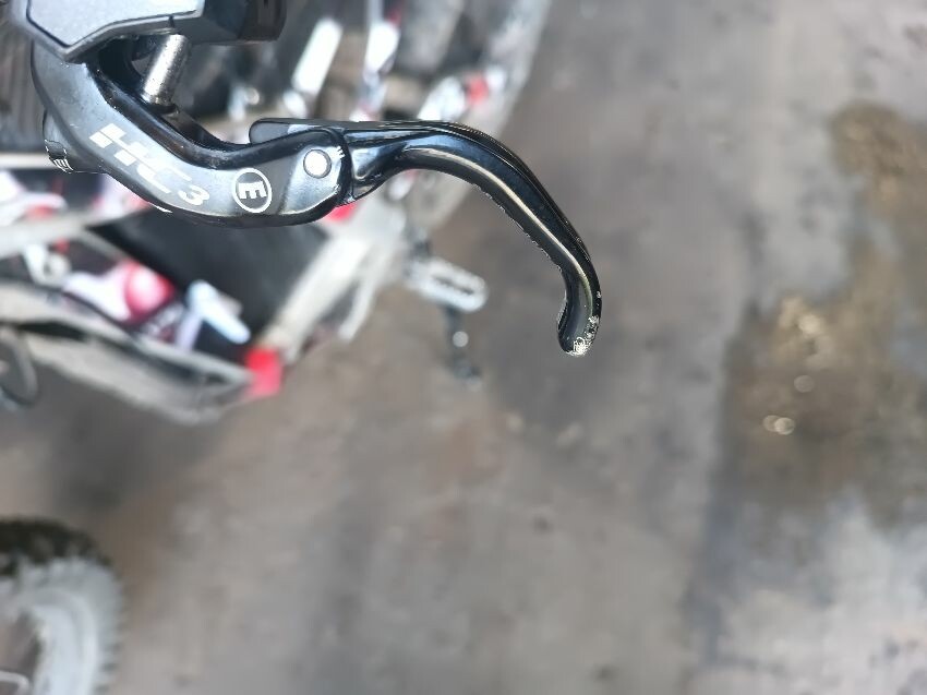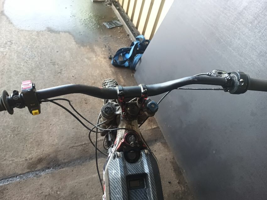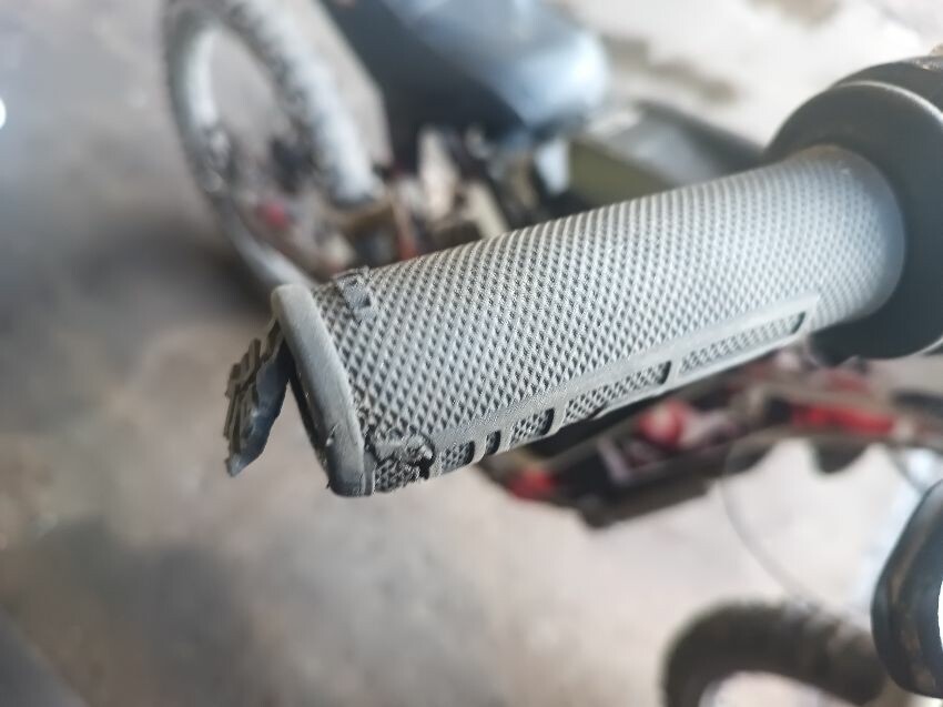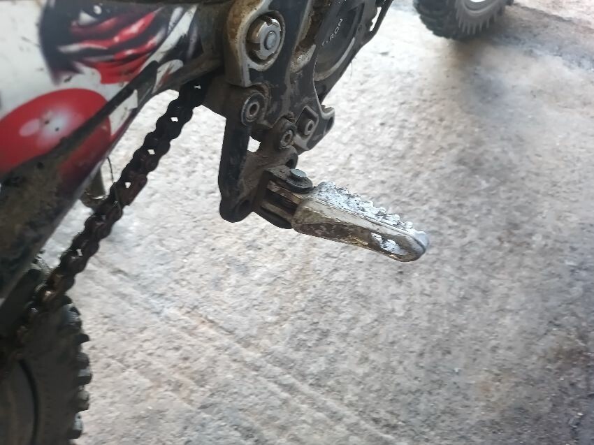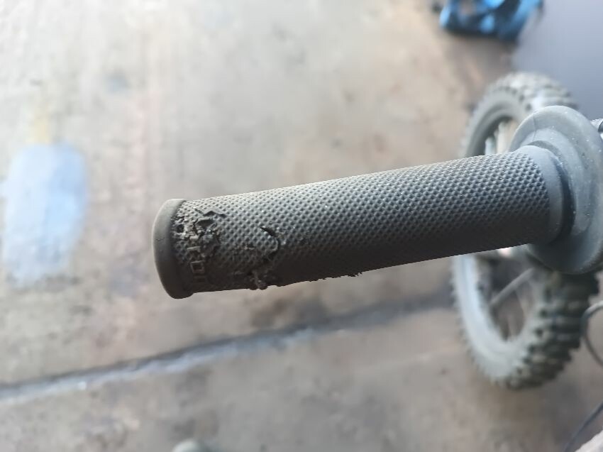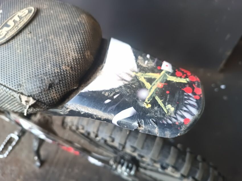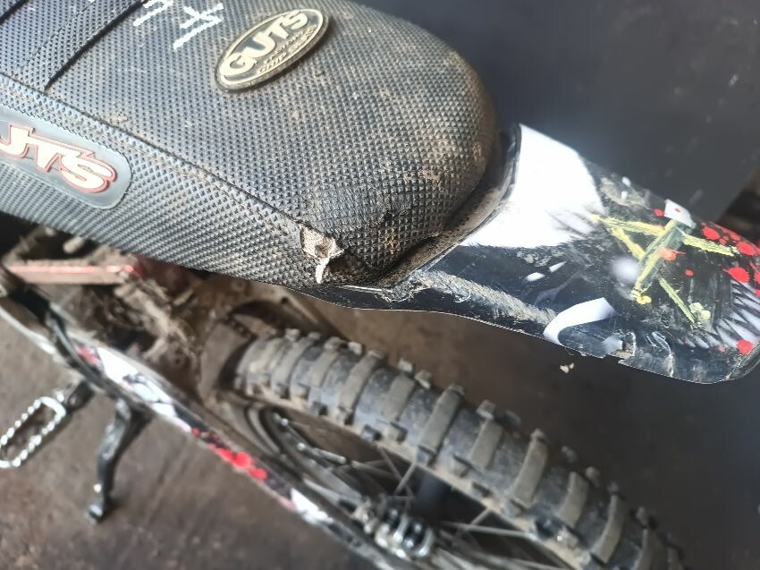 Grips are worn, brake levers bent, screen missing, front fender missing, torn seat, right foot peg loose, rear mud guard is damaged, general wear and tear.