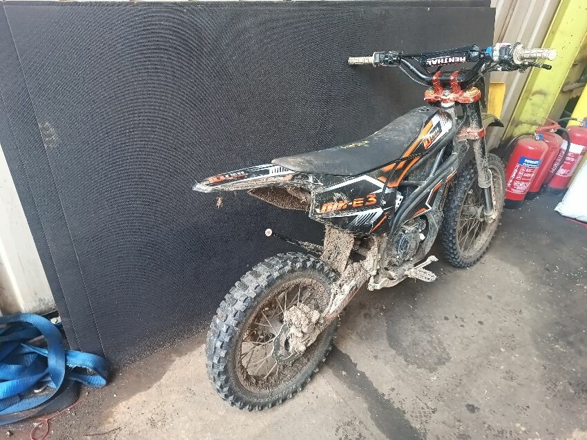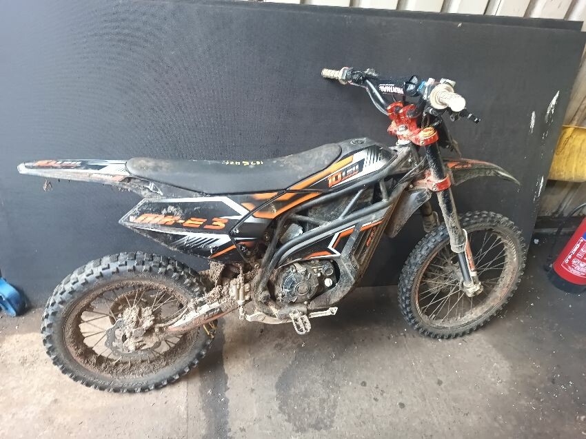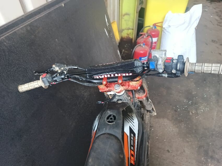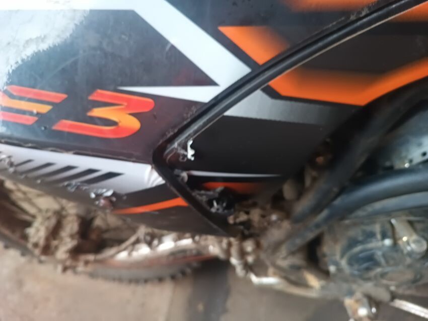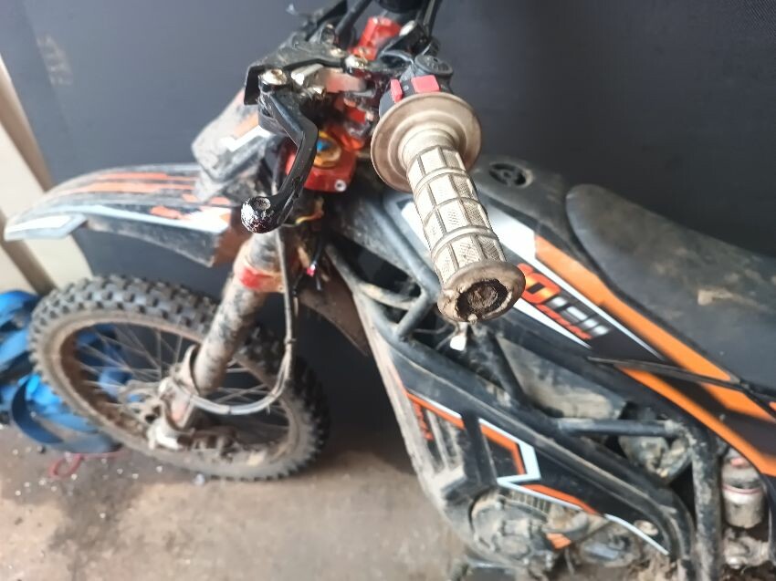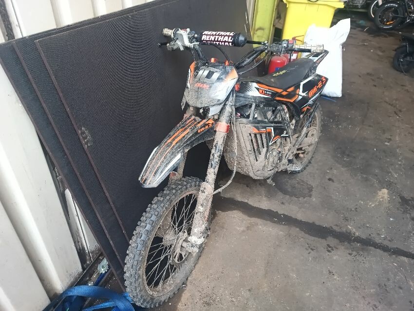 Cut wires, damaged grips, bent side stand, seat is torn, seat plastics scuffed, handlebars bent, number plate is broken, general wear & tear
