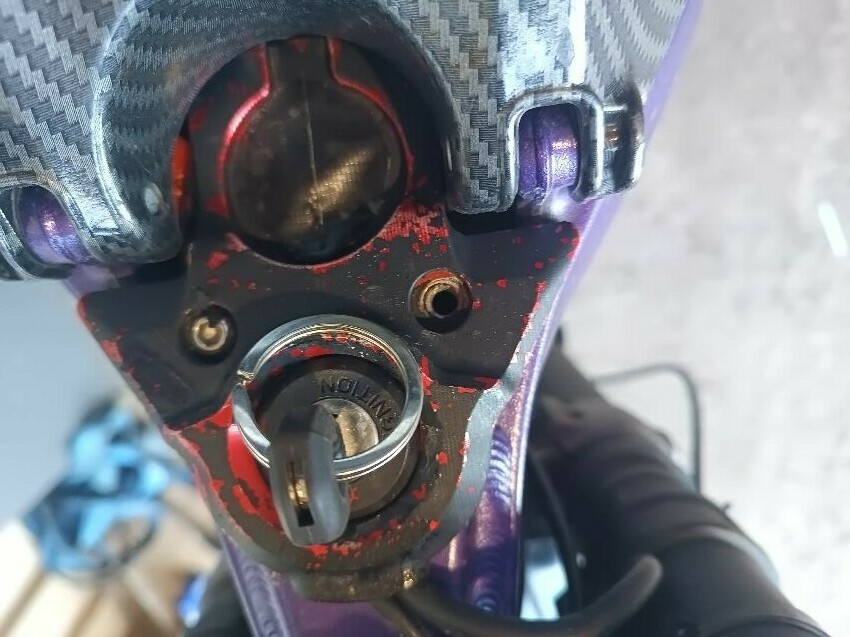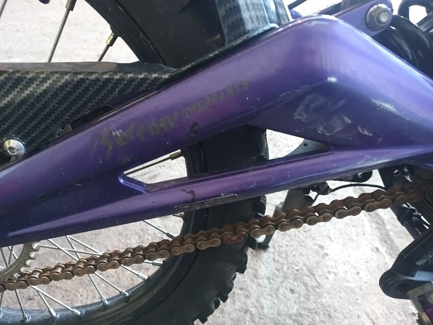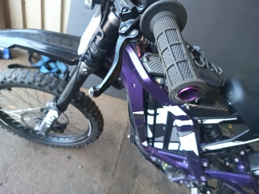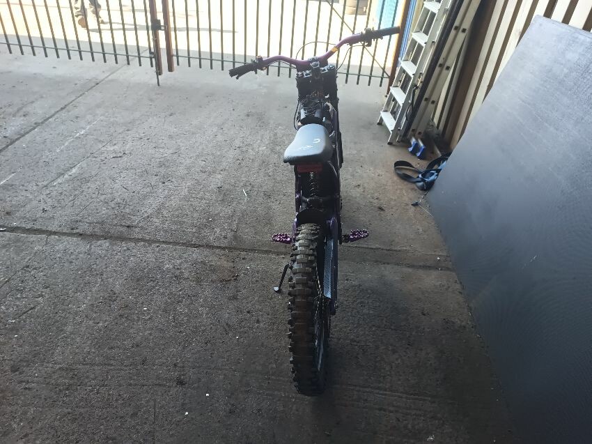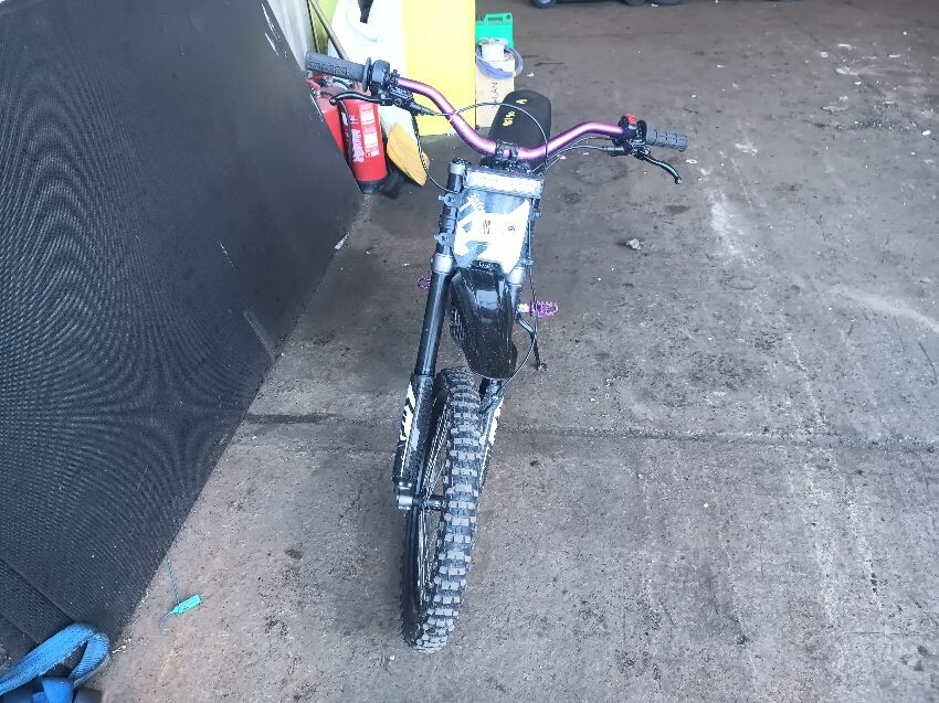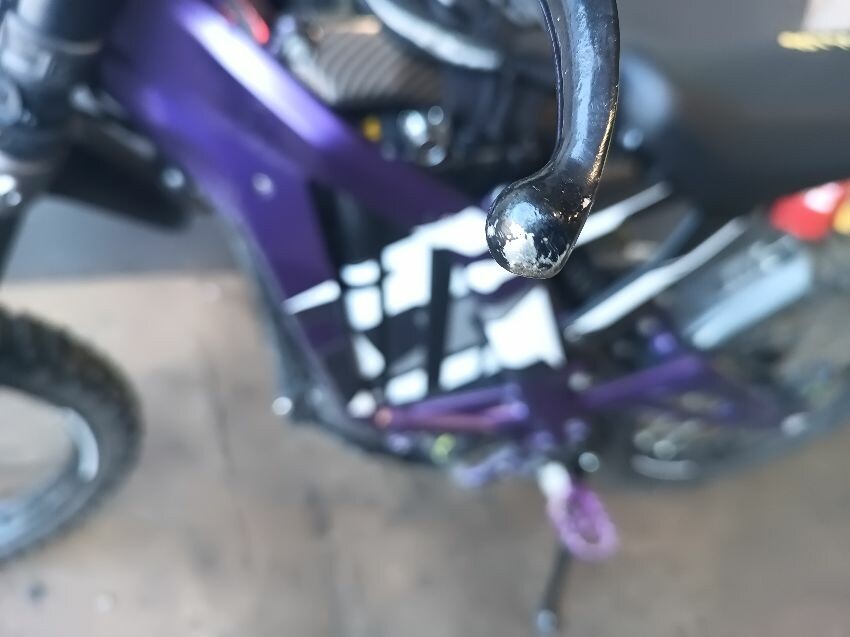 Rear mud guard missing, bar ends damaged, bolt missing from ignition, digital display missing, frame scuffed, left brake lever is damaged, rear swing arm scuffed, general wear & tear.